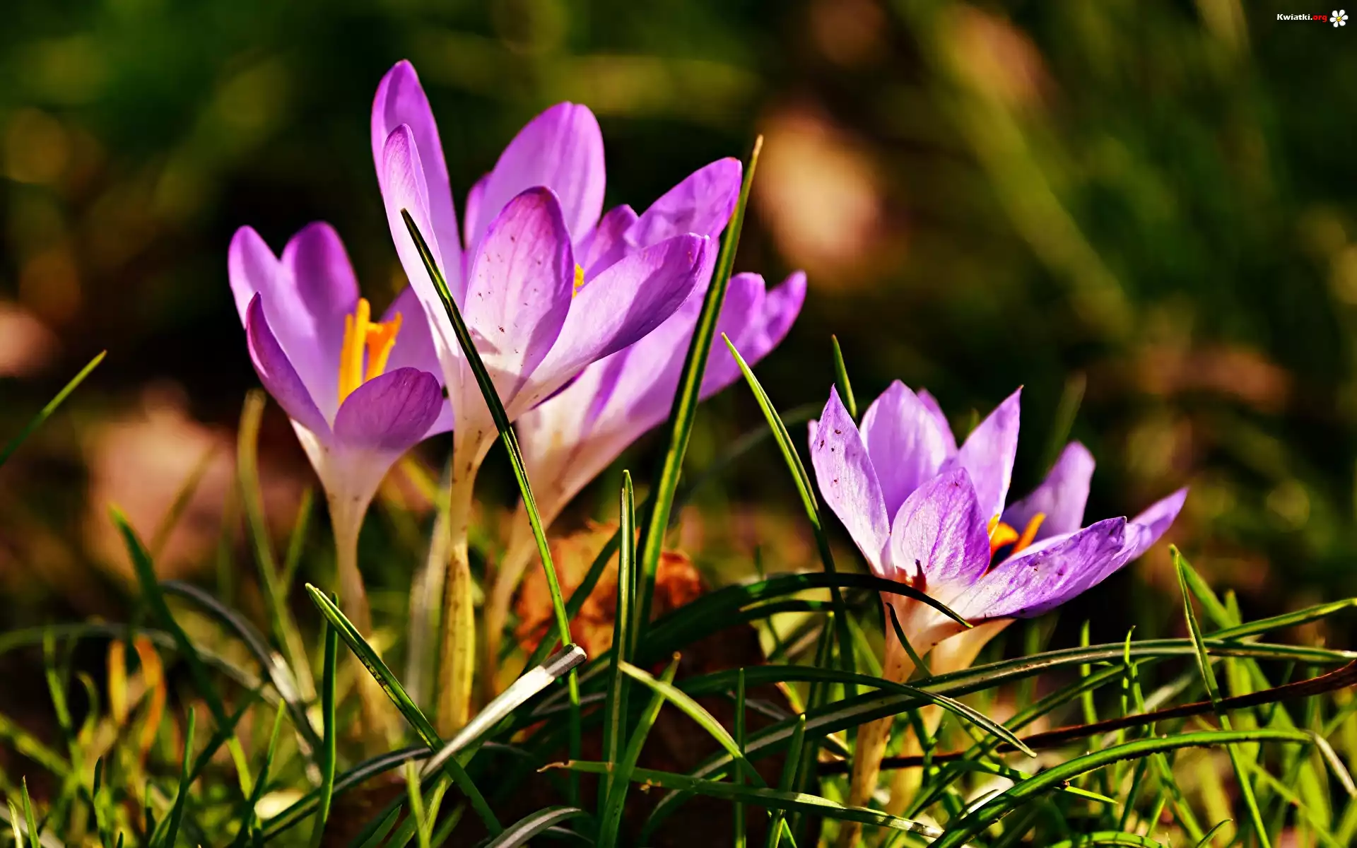 Fioletowe, Kwiaty, Krokusy, Trawa, Zbliżenie - Zdjęcia