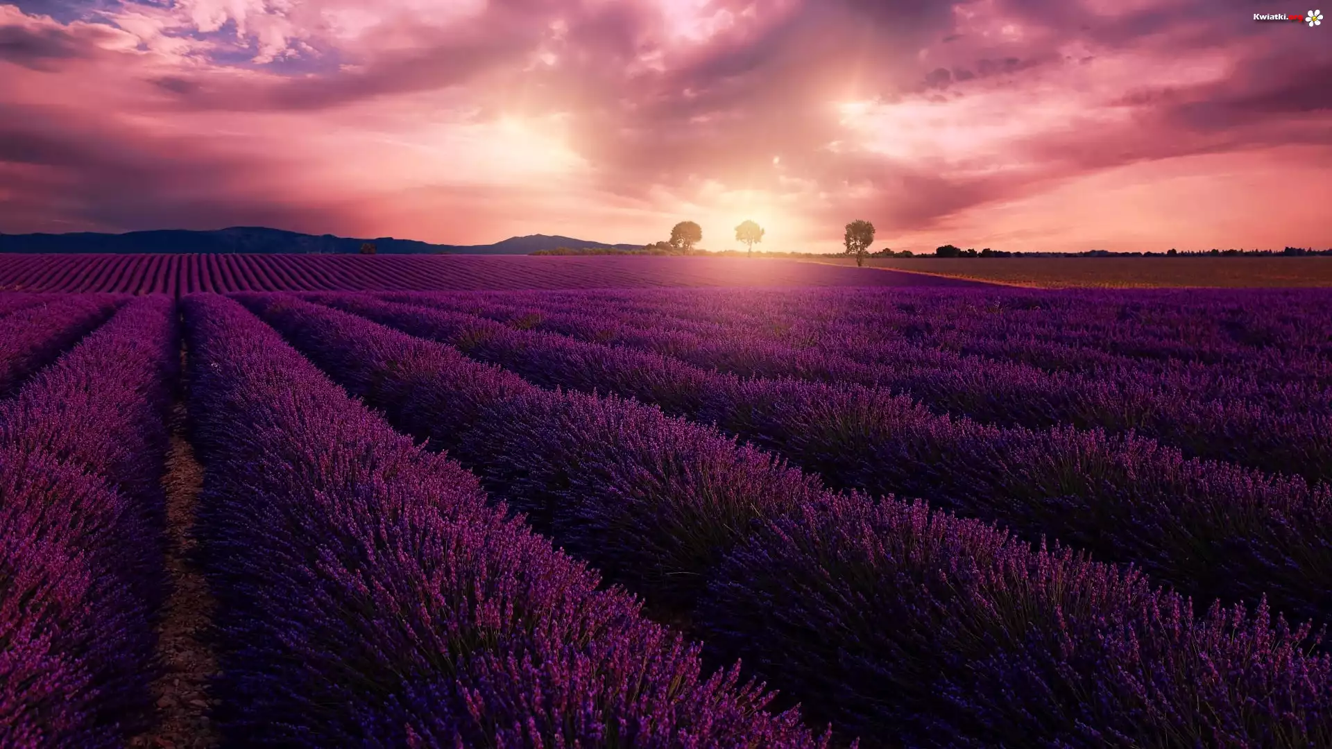 Kwiat Pole, Lawenda, Kolorowe, Niebo, Drzewa, Góry, Valensole, Francja
