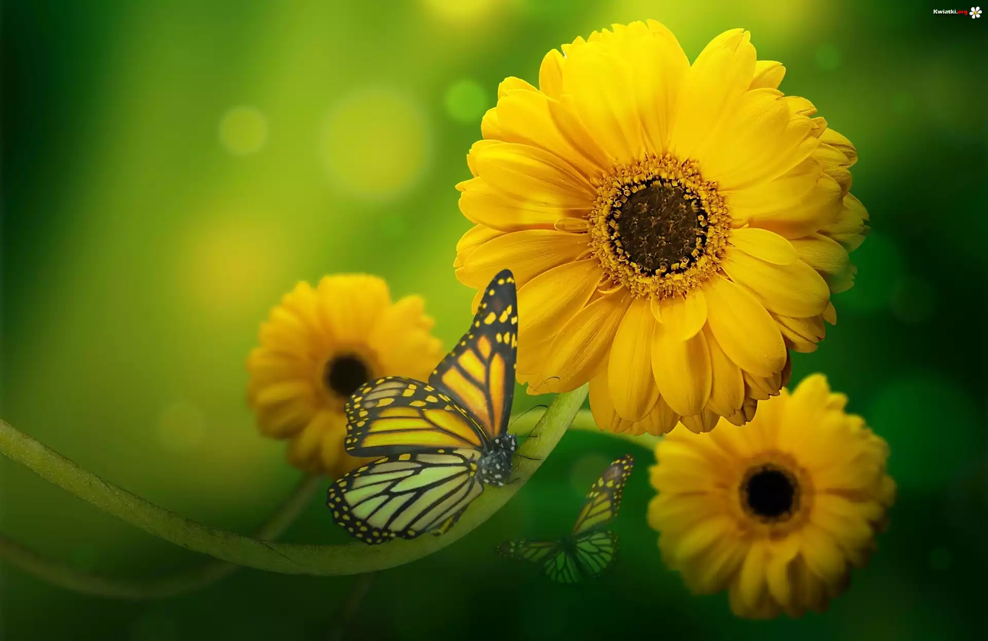 Białe, Czerwone, Gerbery Żółto, Czerwone, Gerbery, Łodygi Dwie, Gerbery, Kubeczek Gąsiennica, Gerber Żółty, Gerber Czerwone, Gerbery, Pudełeczka, Wstążki Gerbery, Wazon Kwiat, Gerber Żółta, Gerbera Gerbery, Liście Gerbera Dwie, Gerbery, Wazon, Woda Gerbery, Tło, Cienie Gerbery