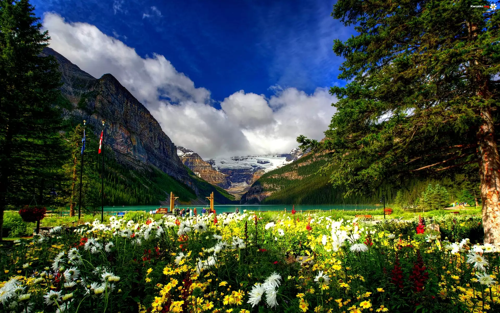 Góry, Jezioro, Park, Kolorowe, Kwiaty - Zdjęcia