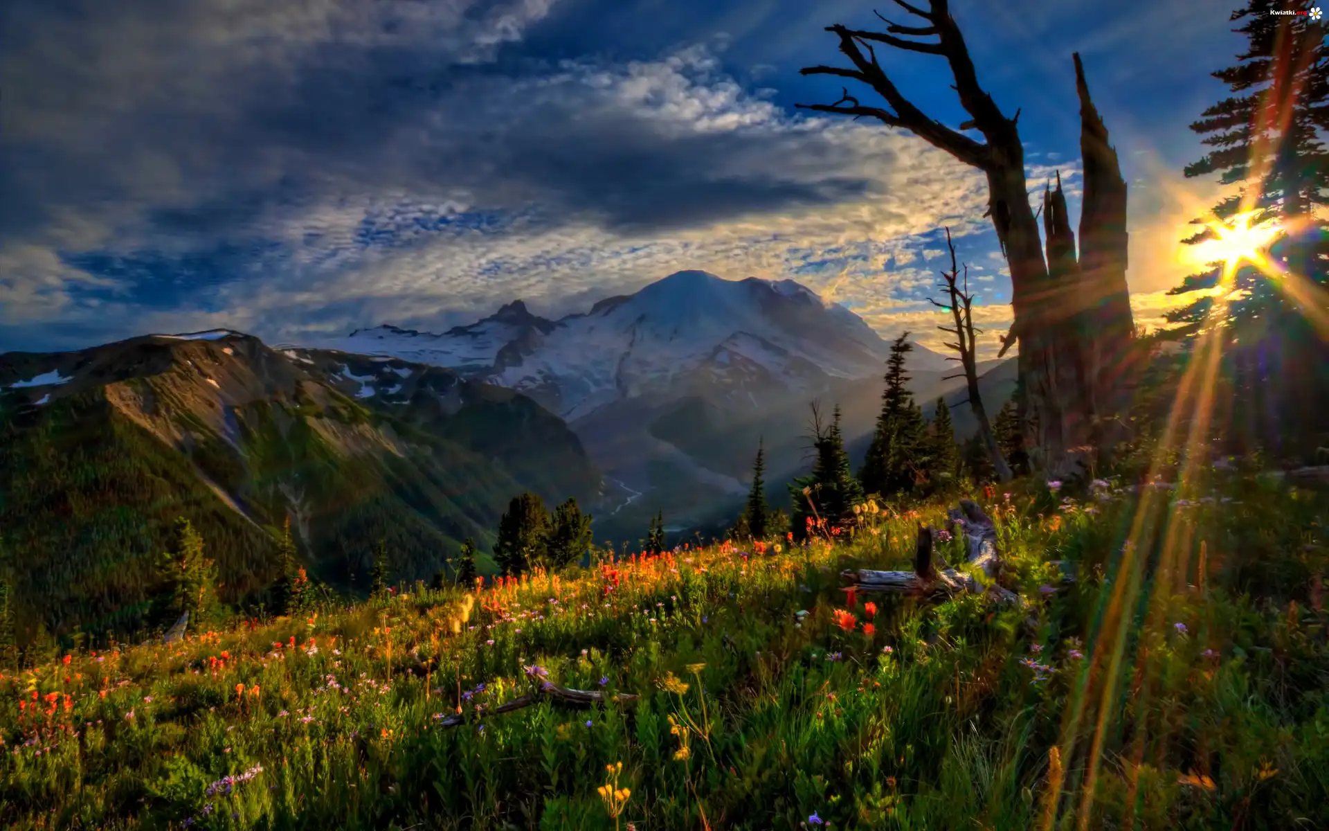 Kwiat Góry, Promienie, Słońca, Trawa, Kwiaty