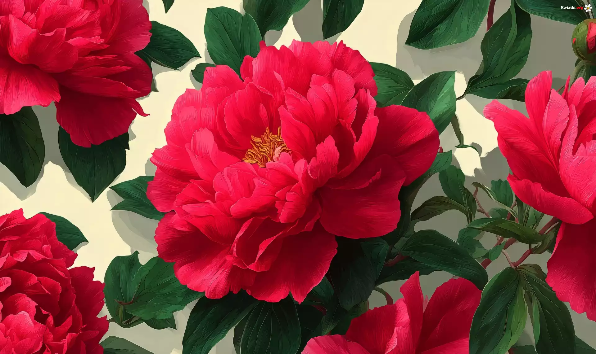 Czerwone, Piwonie, Liście, Grafika - Zdjęcia
