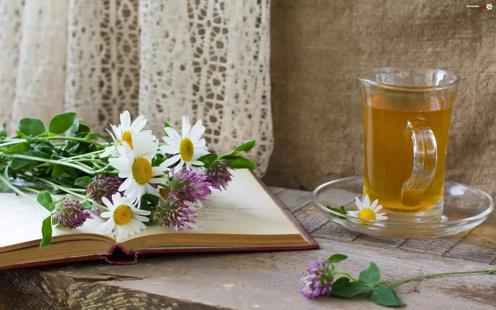 Filiżanka, Herbaty, Bukiet, Polnych, Kwiatów, Książka, Okno - Zdjęcia