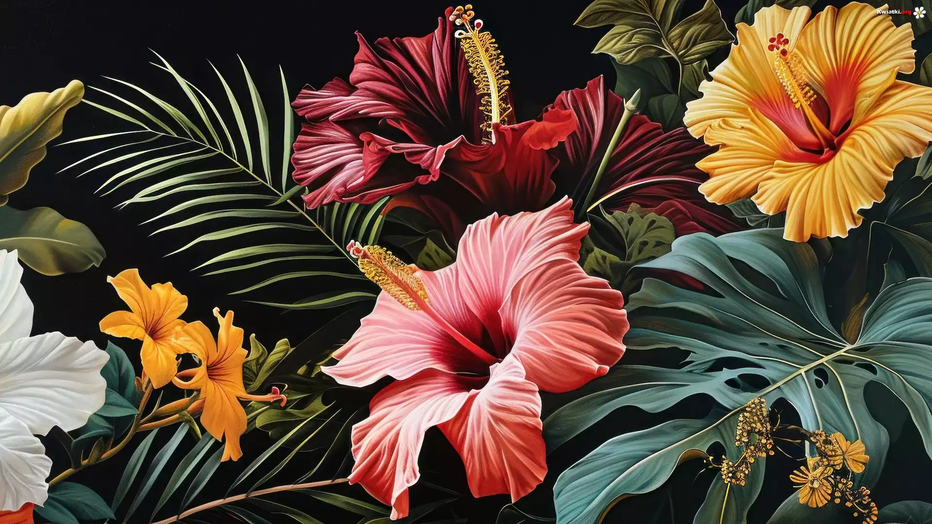 Grafika, Kwiaty, Liście, Hibiskusy - Zdjęcia