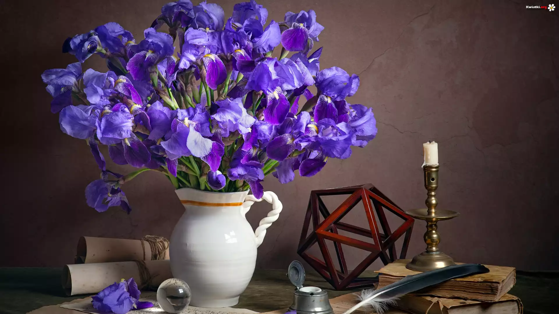 Niebieskie, Irysy, Dzbanek, Świeczka, Kompozycja - Zdjęcia