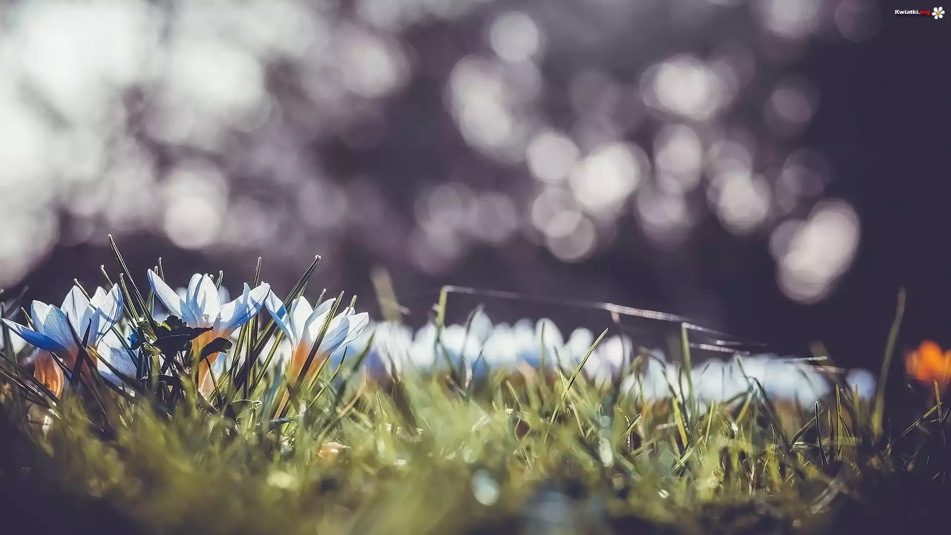 Kwiaty, Jasnoniebieskie, Krokusy, Trawa - Zdjęcia