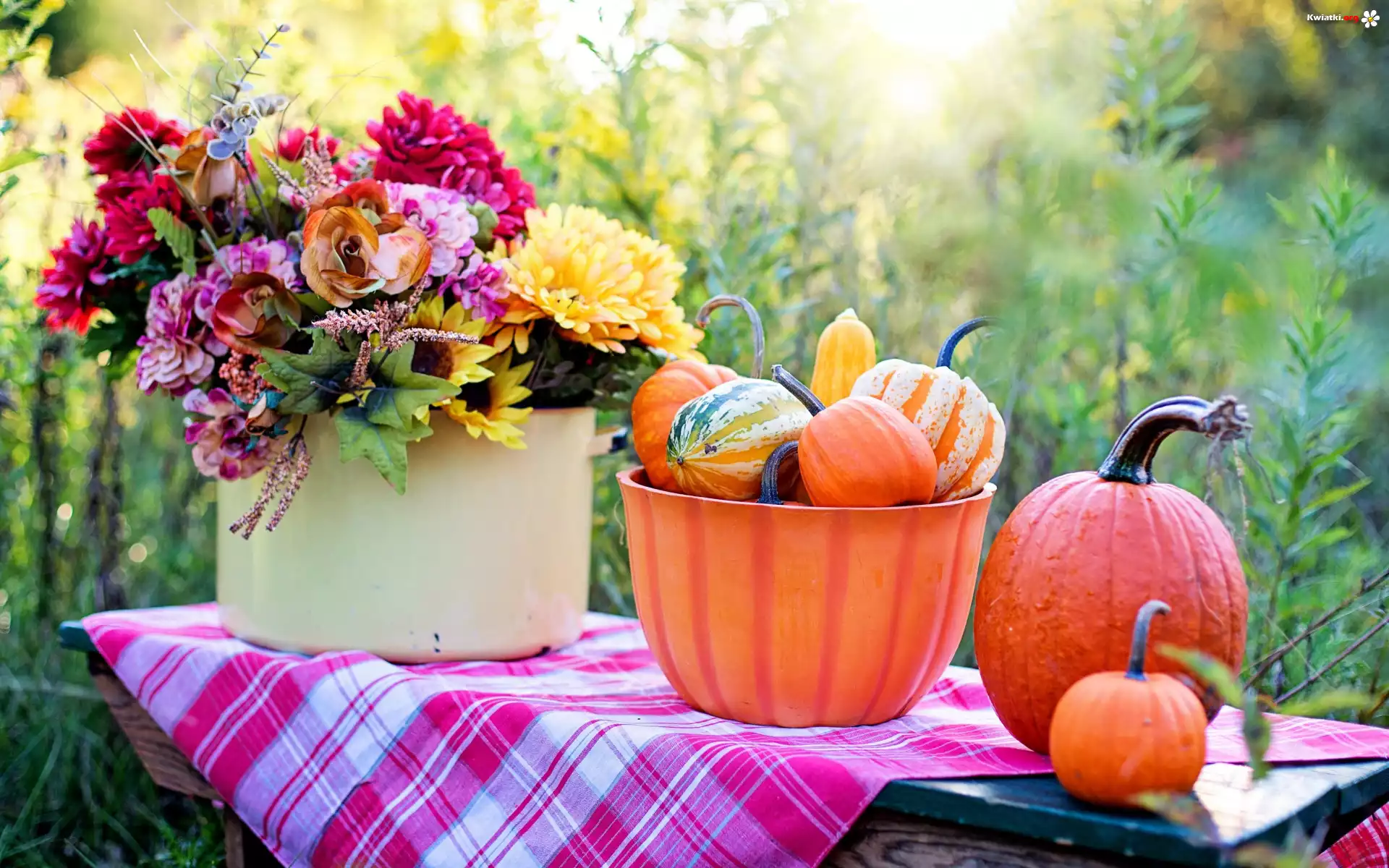Ogród, Jesień, Dynie, Miska, Kwiaty, Bukiet, Kompozycja - Zdjęcia
