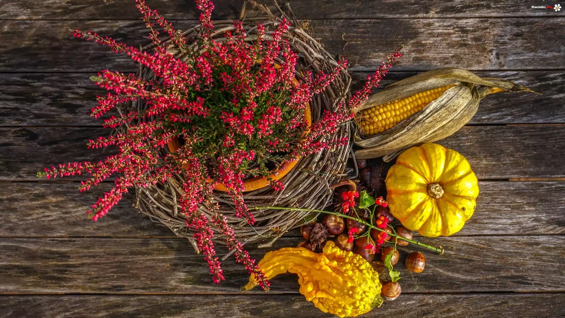 Kompozycja, Jesienna, Wrzos, Kukurydza, Dynia Sweet Dumpling - Zdjęcia