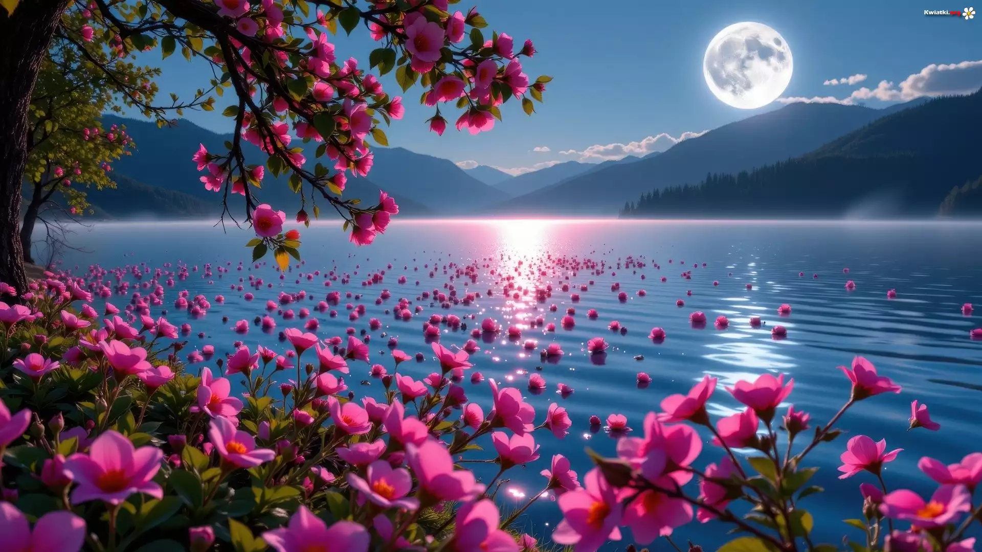 Jezioro, Góry, Noc, Księżyc, Rośliny, Czerwone, Kwiaty, Kwitnące, Drzewo - Zdjęcia