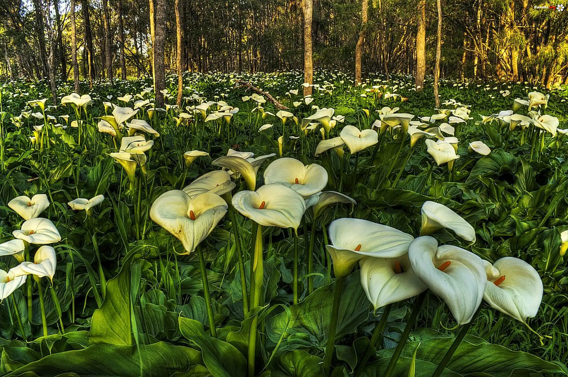 Kalie, Las, Drzewa, Promienie, Słońca Różowe, Kalie Biały, Kwiat, Kalia Przyroda, Kwiat, Kalia, Żółta Różowa, Kalia, Zielone, Liście Żółta, Kalia Kalia, Biała, Kieliszek, Szampan Łąka, Rów, Białe, Kalie Żółte, Kalie, Łodygi Pomarańczowe, Kalie Dłoń, Kalia, Ślimaczek Kalia Trzy, Białe, Kalie Pomarańczowe, Kalie, Liście