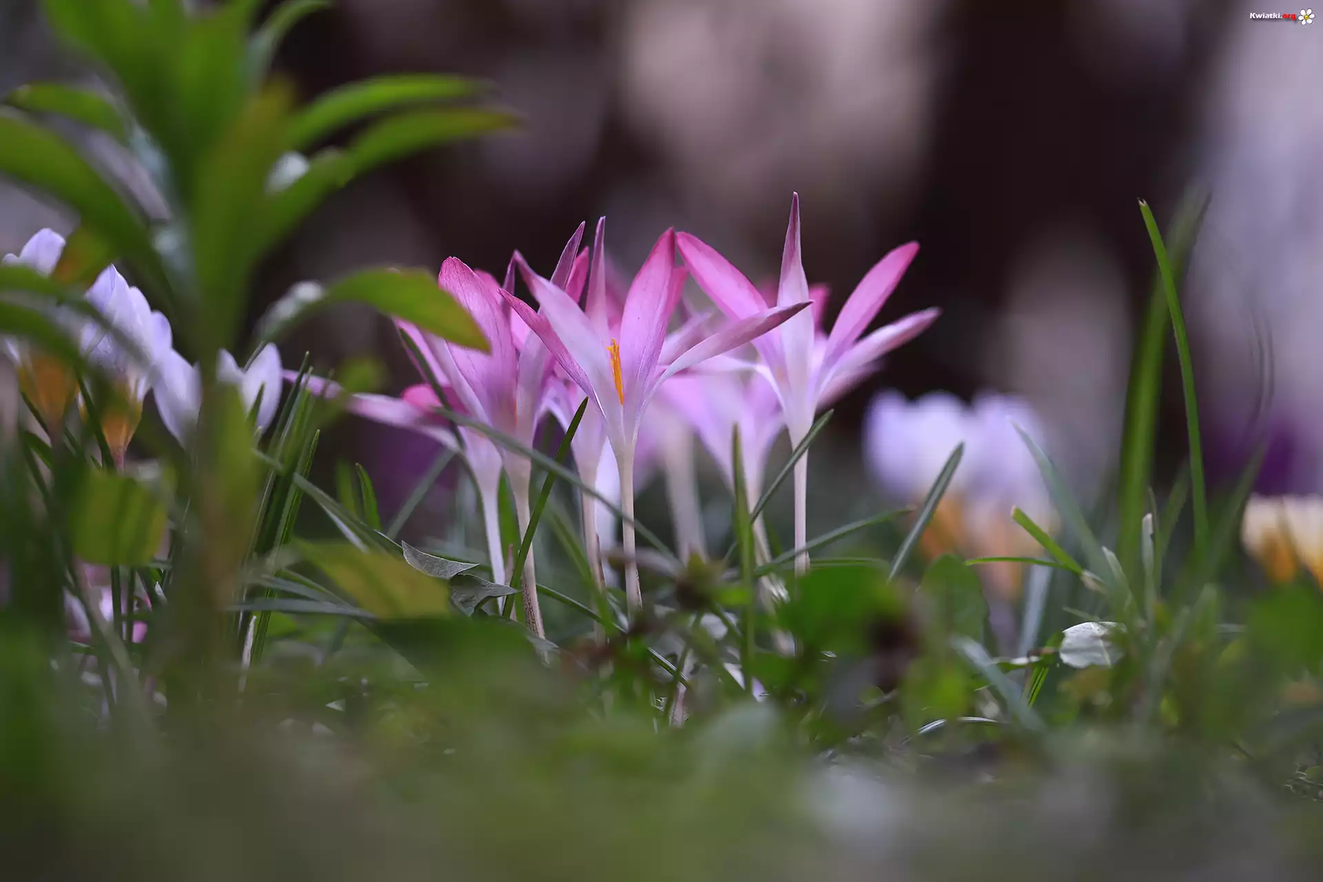 Różowe, Krokusy, Kwiaty, Kępka, Rozmyte tło - Zdjęcia