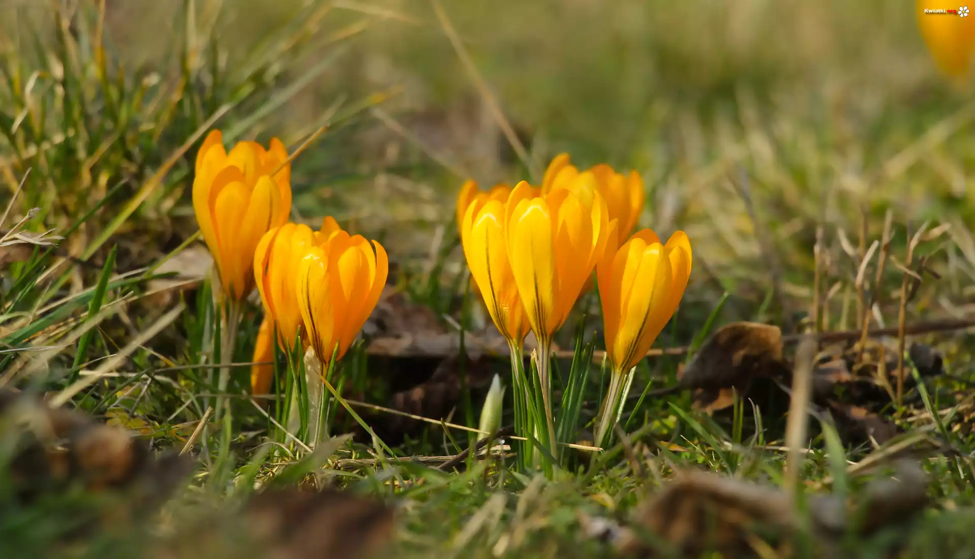 Kwiat Żółte, Krokusy, Trawa, Kępki