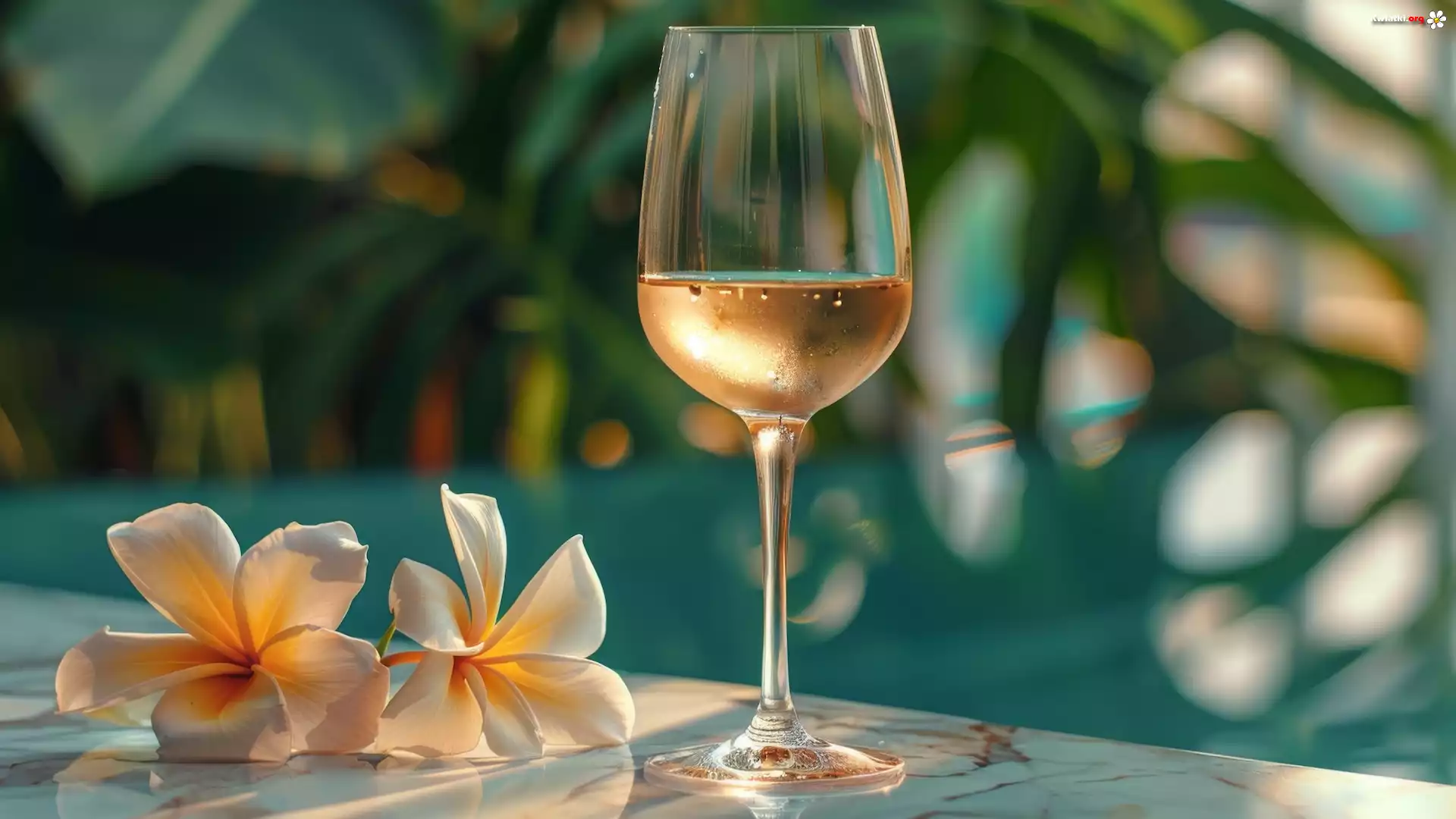 Kompozycja, Kieliszek, Wino, Kwiaty, Plumeria - Zdjęcia