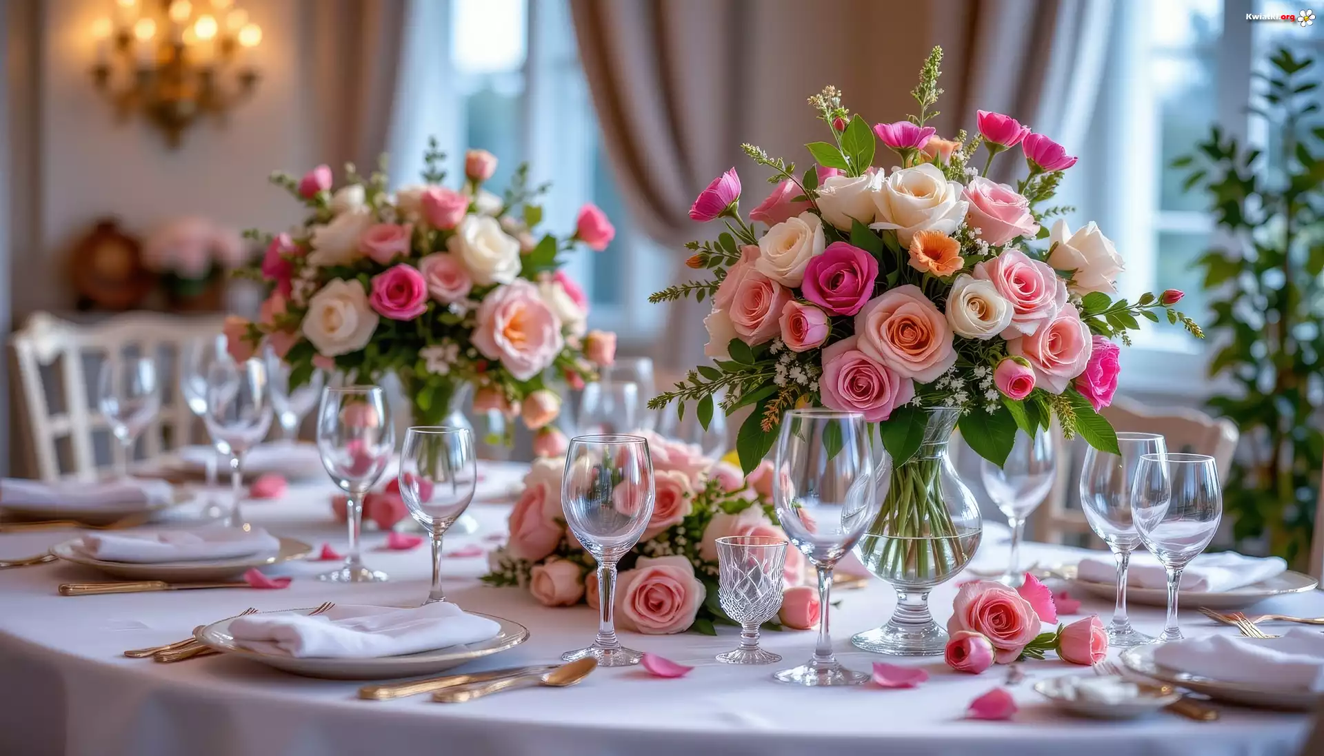 Róże, Bukiety, Stół, Kieliszki, Grafika AI - Zdjęcia