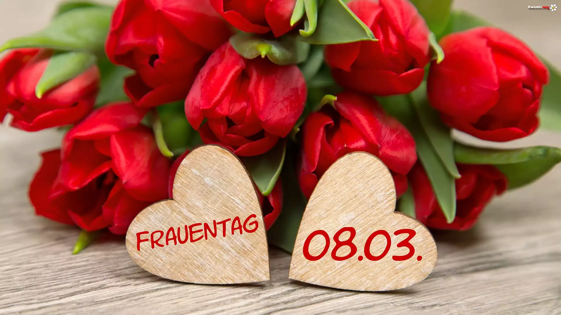 Dzień Kobiet, Bukiet, Czerwone, Tulipany, Serca, Napis - Zdjęcia
