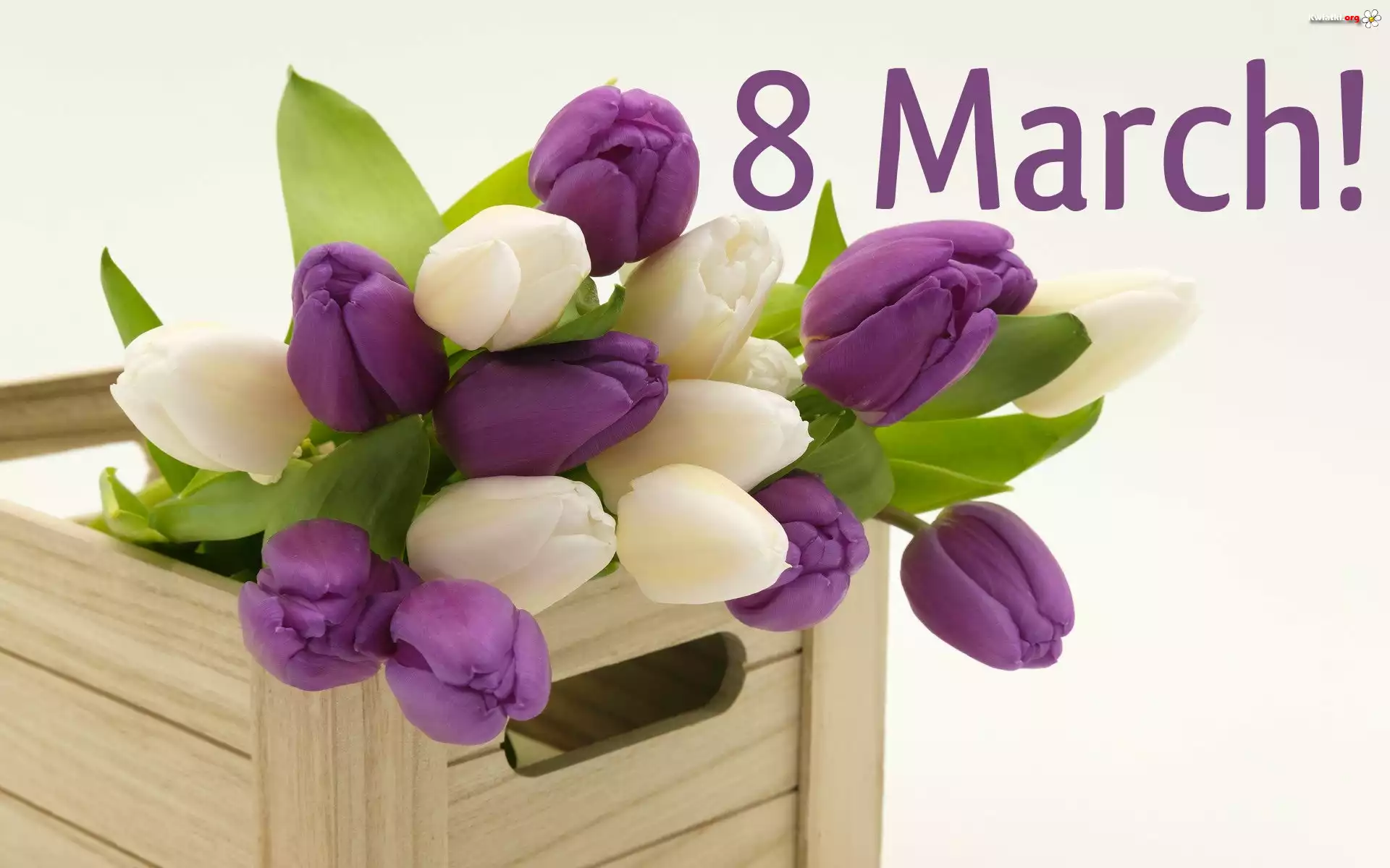 Kwiat Dzień Kobiet, Bukiet, Fioletowe, Białe, Tulipany, Skrzynka, Napis