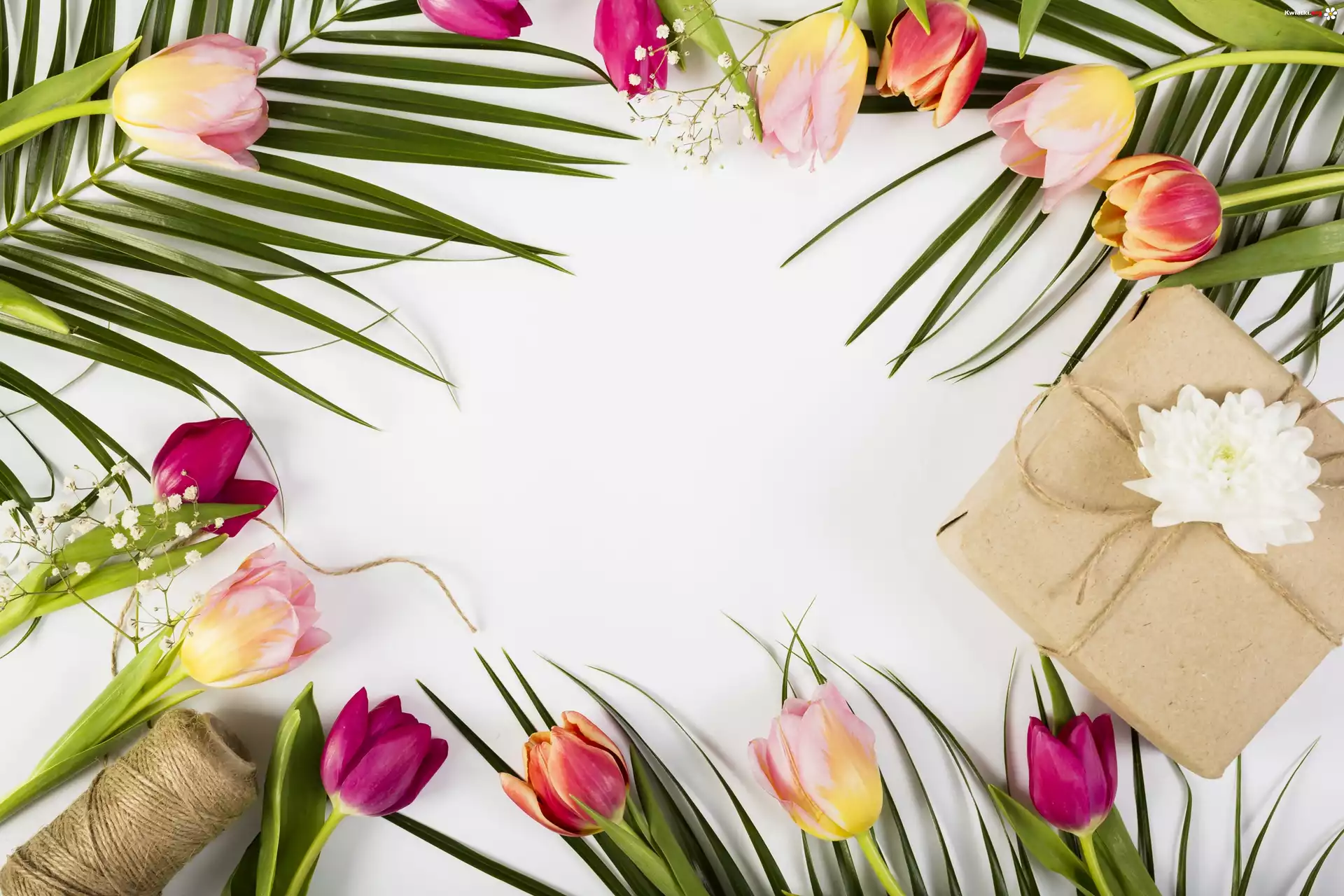 Kwiat Kolorowe, Tulipany, Liście, Palmy, Prezent