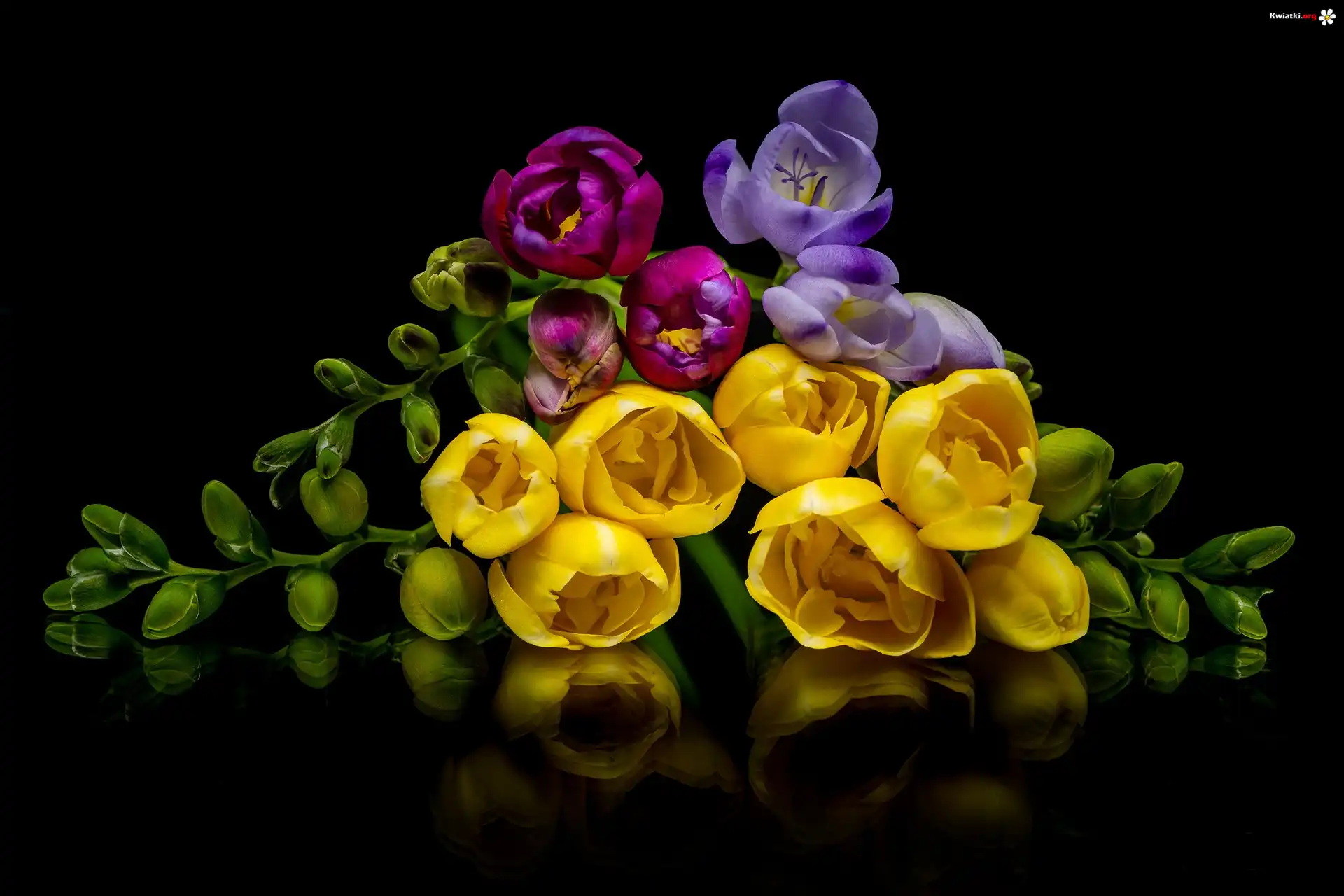Kwiat Kolorowe, Frezje, Czarne tło, Odbicie
