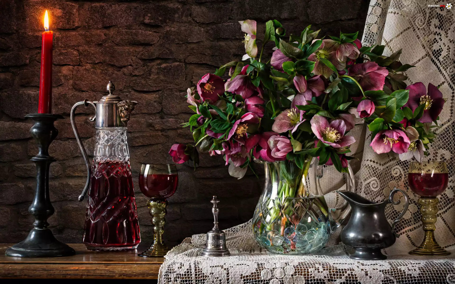Kwiat Wazon, Kwiaty, Ciemierniki, Kieliszki, Wino, Karafka, Świeca, Kompozycja