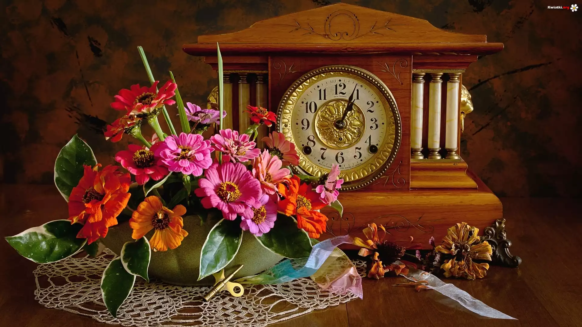 Kompozycja, Bukiet, Kwiaty, Cynie, Zegar - Zdjęcia