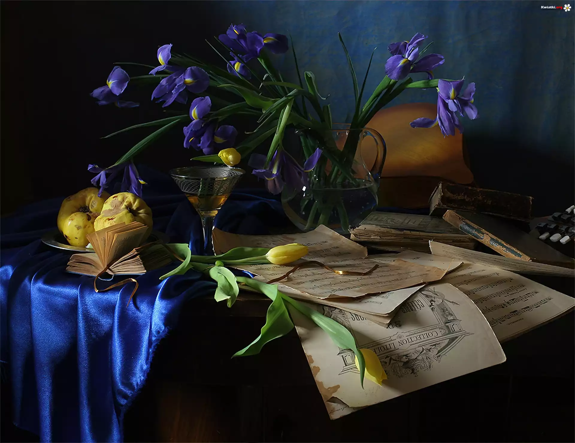 Kompozycja, Irysy, Tulipany, Lampka, Wina - Zdjęcia