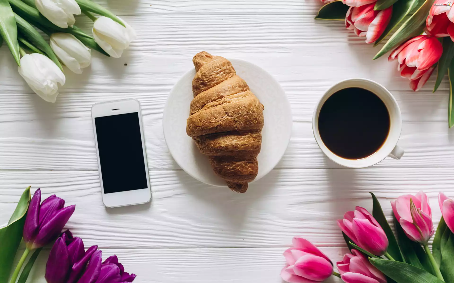 Kwiat Kwiaty, Tulipany, Rogal, Telefon, Kawa, Filiżanka, Talerzyk, Deski, Kompozycja