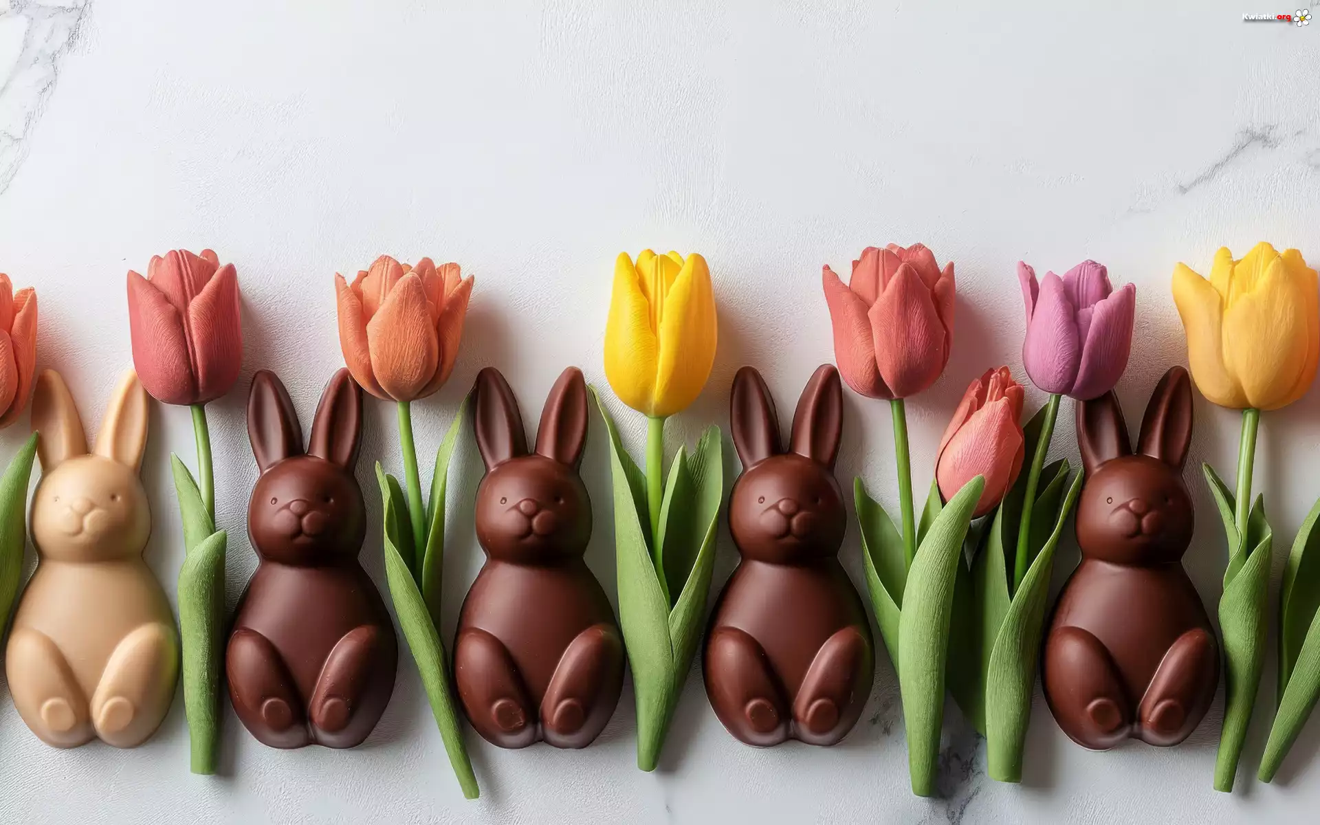 Kwiat Kwiaty, Kolorowe, Tulipany, Czekoladowe, Króliki, Białe, Tło, Kompozycja