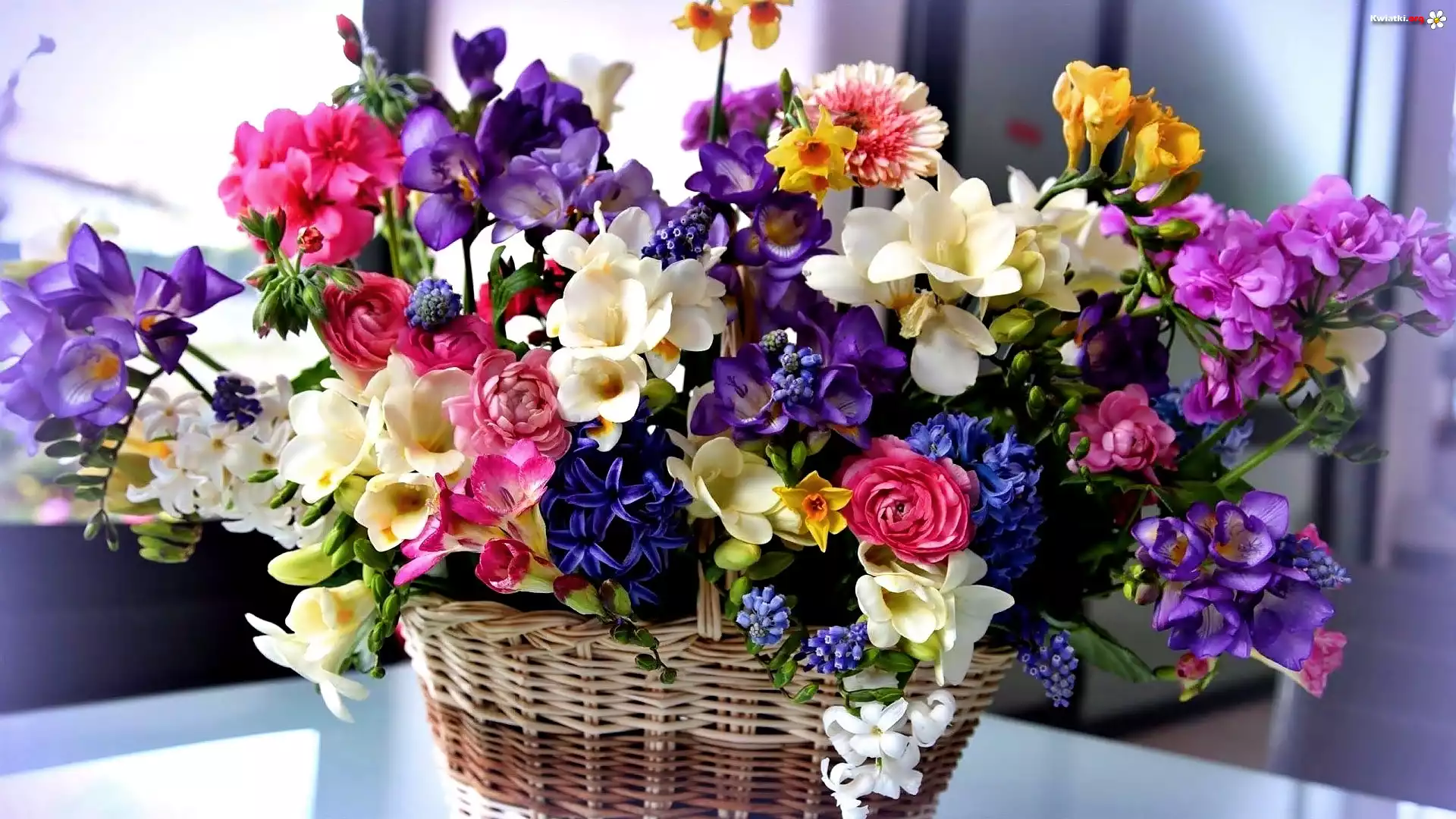 Kosz, Kwiatów, Frezje, Róże - Zdjęcia
