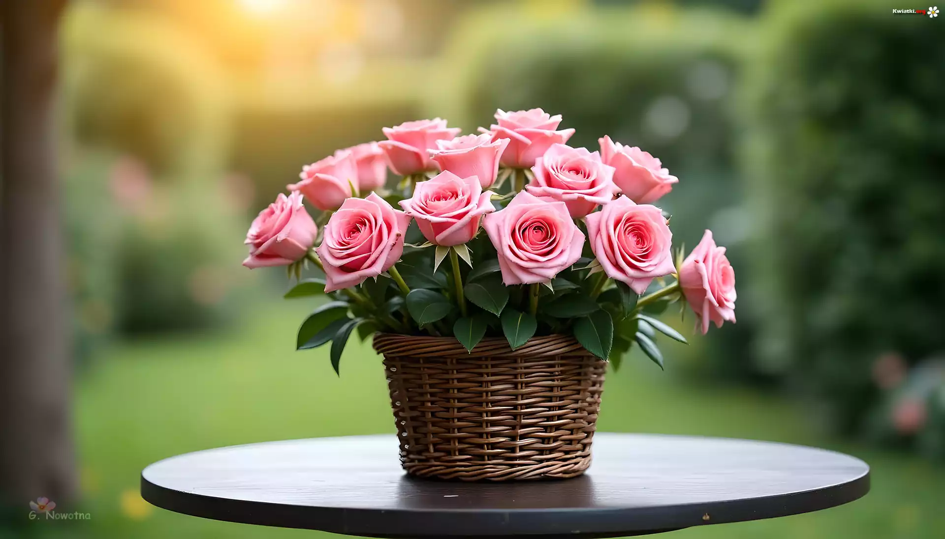 Różowe, Róże, Kwiaty, Koszyk, Stolik, Grafika - Zdjęcia