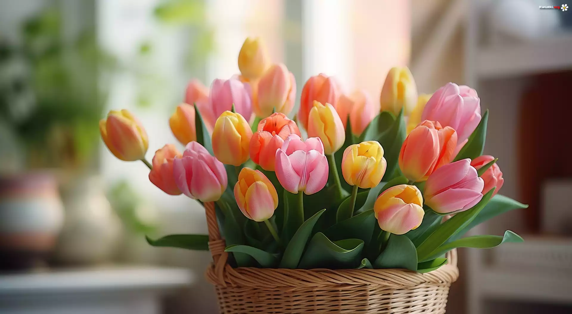 Kompozycja, Kolorowe, Tulipany, Koszyk - Zdjęcia