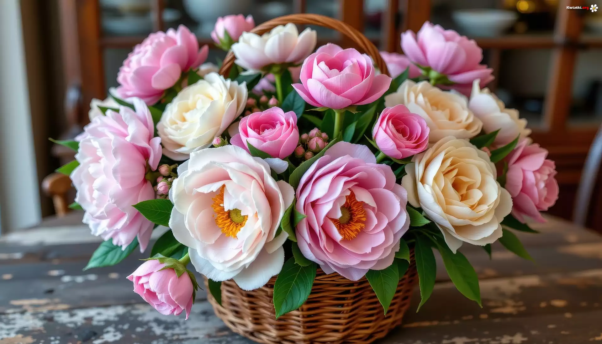 Kwiaty, Piwonie, Różowe, Kremowe, Koszyk, Stół - Zdjęcia