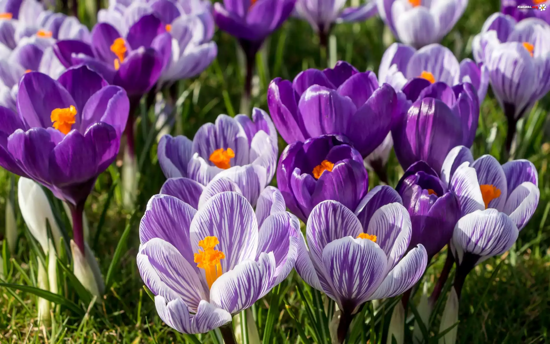 Krokusy, Liliowe, Fioletowe, Trawa - Zdjęcia