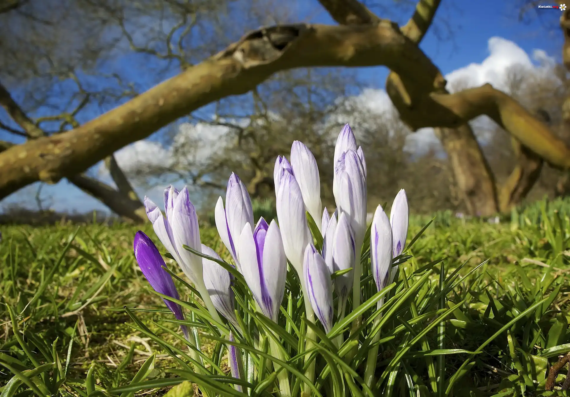 Kwiat Krokusy, Trawa, Konar, Drzewa