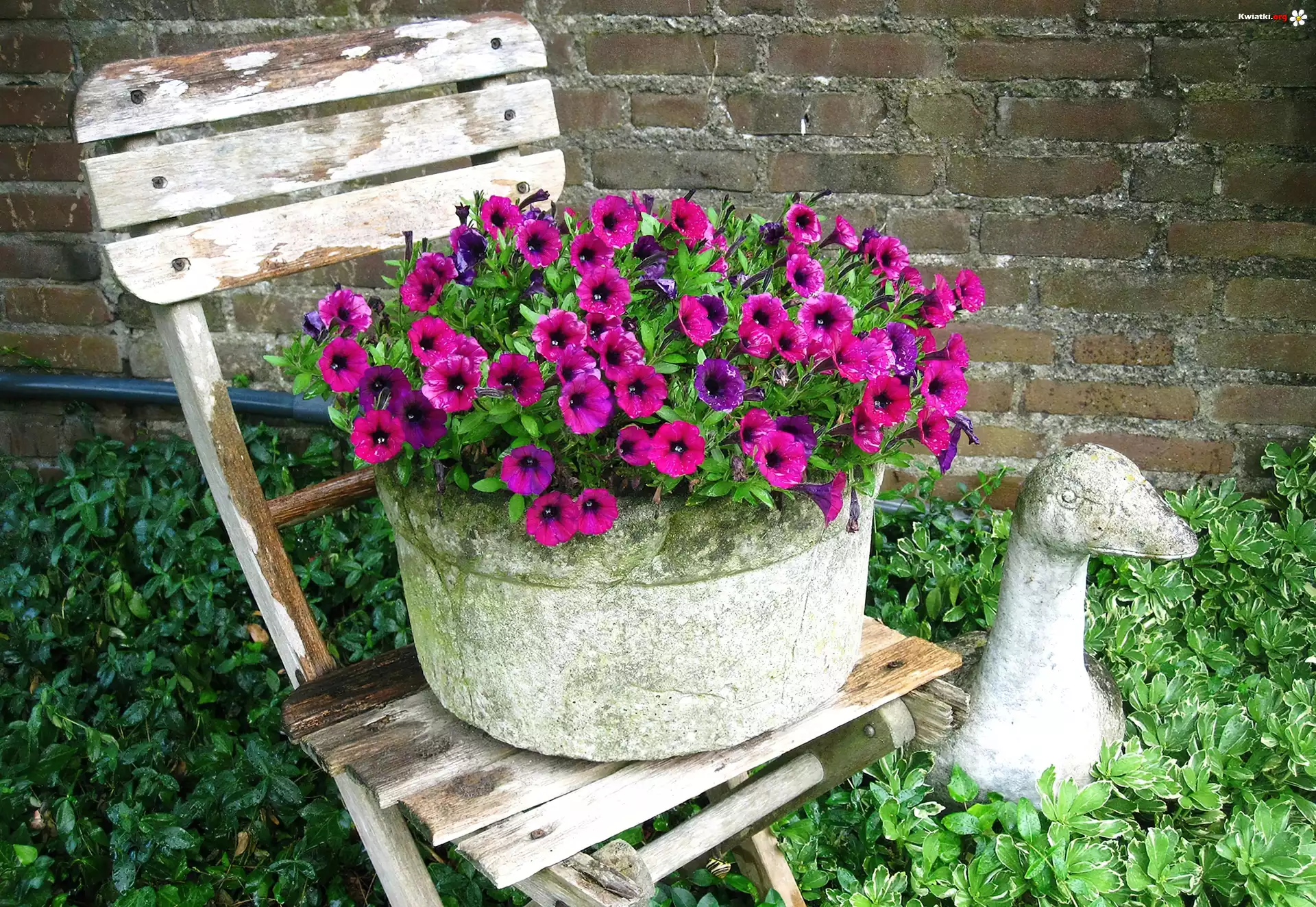 Kwiat Ogródek, Krzesło, Kamienna Donica, Gąska, Petunie, Mur