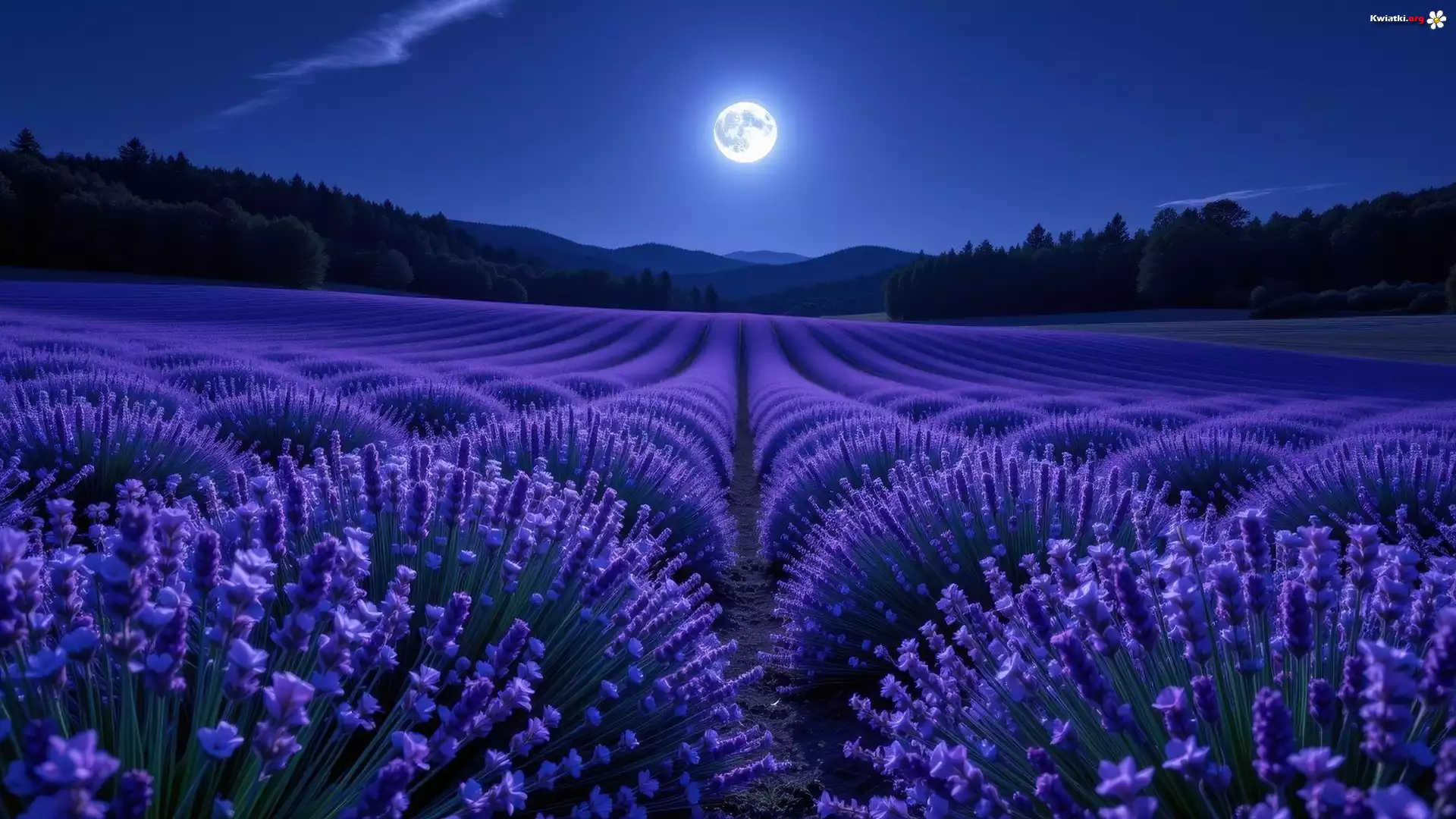 Kwiat Lawenda, Pole, Noc, Księżyc, Drzewa, Góry, AI