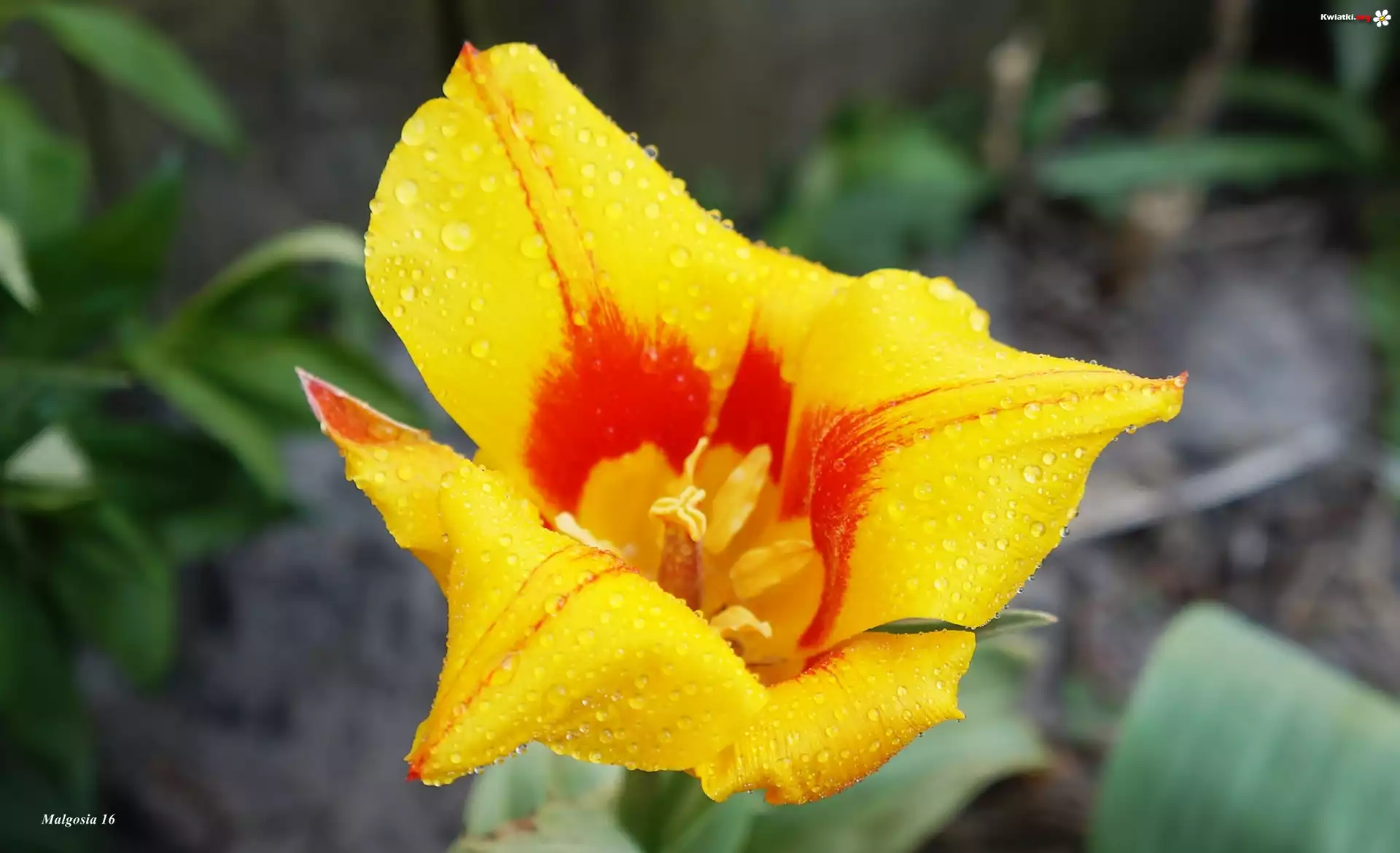 Kwiat, Żółty, Czerwony, Tulipan, Krople, Rosa - Zdjęcia