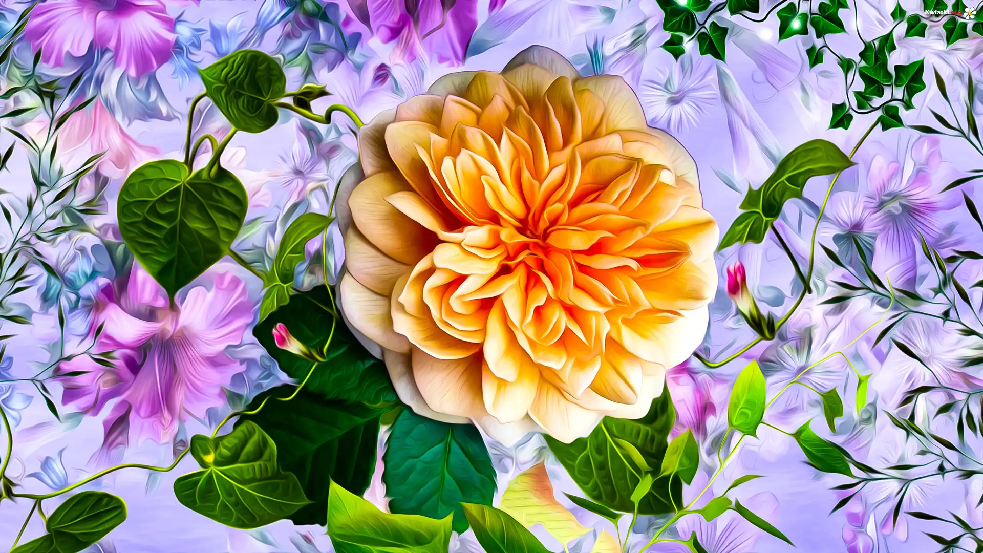 Kwiat, Żółta, Dalia, Liście, Powój, Grafika - Zdjęcia