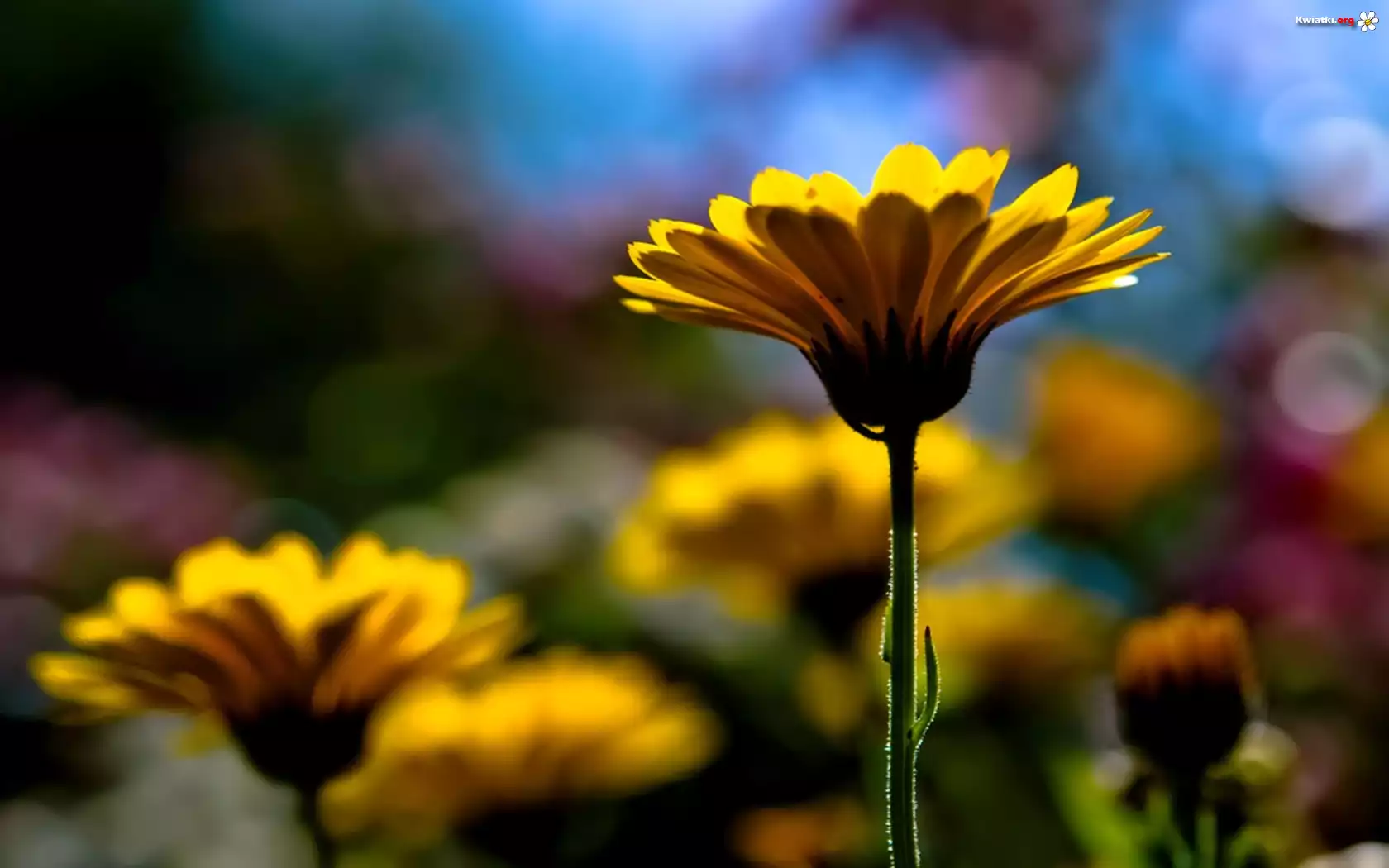 Kobieta, Żółta, Suknia, Białe, Kwiatki Doniczka, Kolorowe, Kwiaty Pomarańczowy, Kwiat Fioletowy, Kwiat Kwiat, Płatki, Krople, Wody Rośliny, Kwiatki, Margerytki Latająca, Pszczoła, Kwiaty Forsycja Niebieskie, Białe, Kwiaty, Wazon Niebo, Biały, Kwiat Różowy, Kwiat Zachód, Słońca, Woda, Kwiaty Kwiat, Płatki, Krople, Wody Cynia