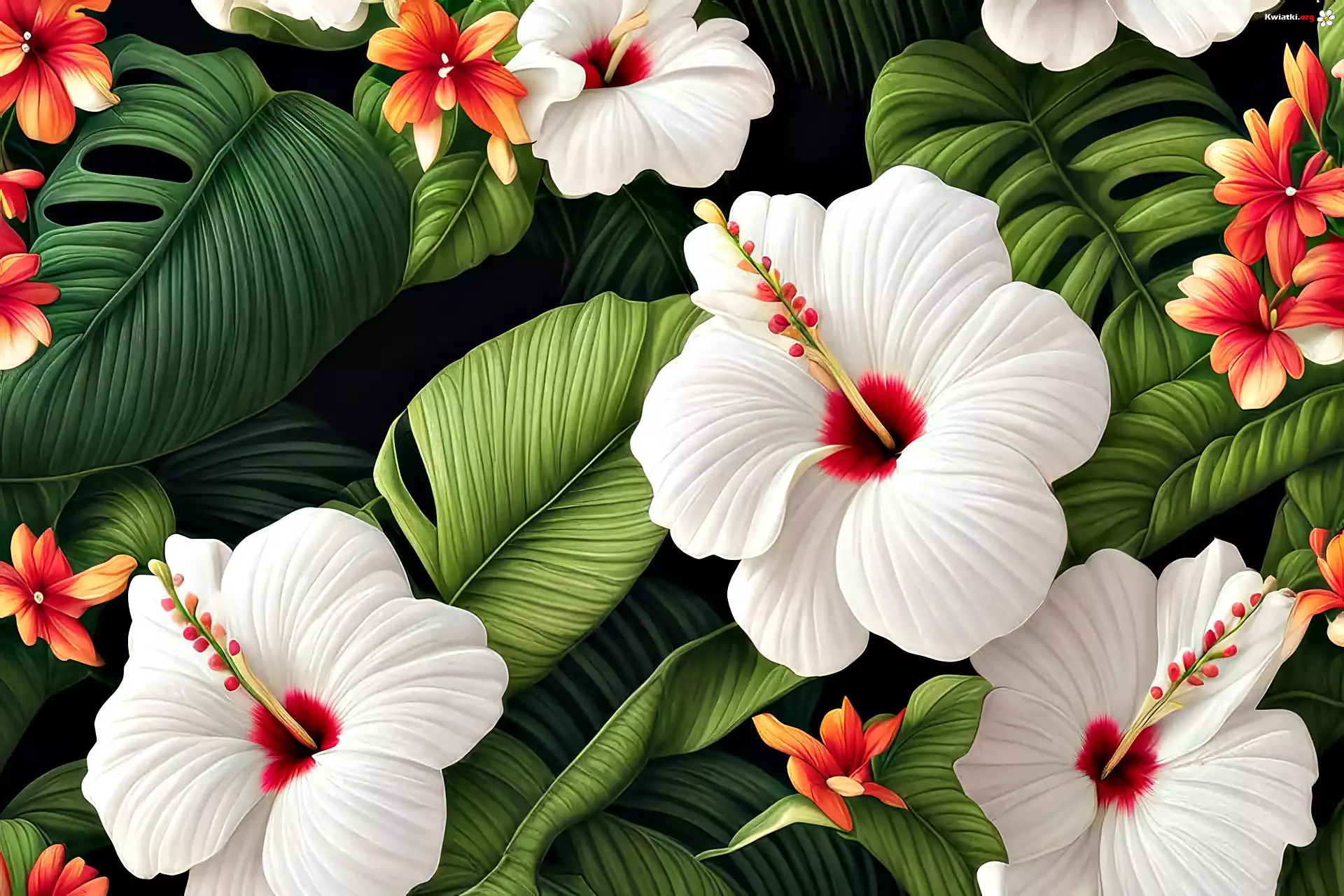 Hibiskusy, Kwiaty, Białe, Liście, Grafika - Zdjęcia