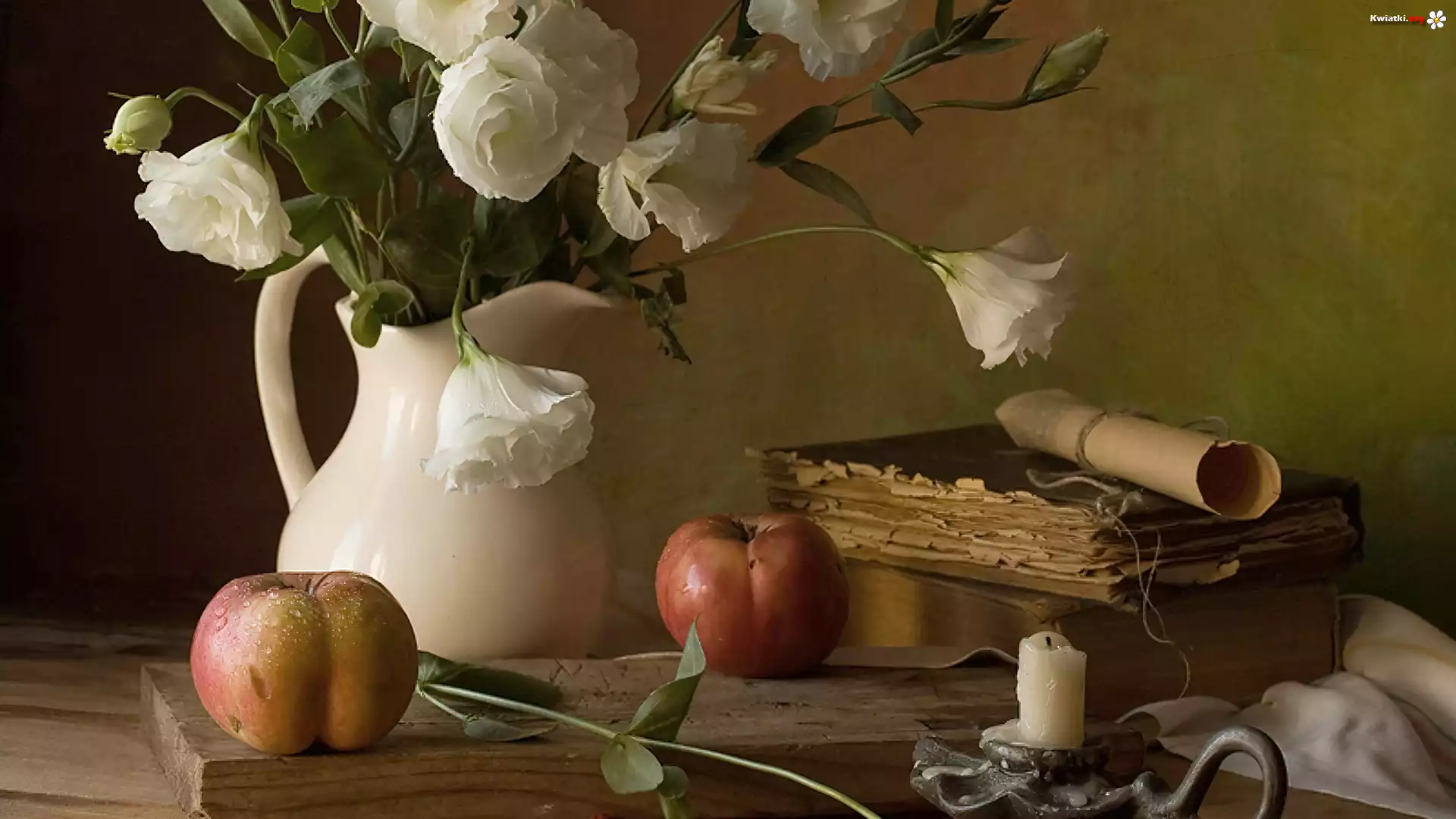 Białe, Kwiaty, Dzbanek, Stare, Książki, Jabłka, Świeca, Kompozycja - Zdjęcia