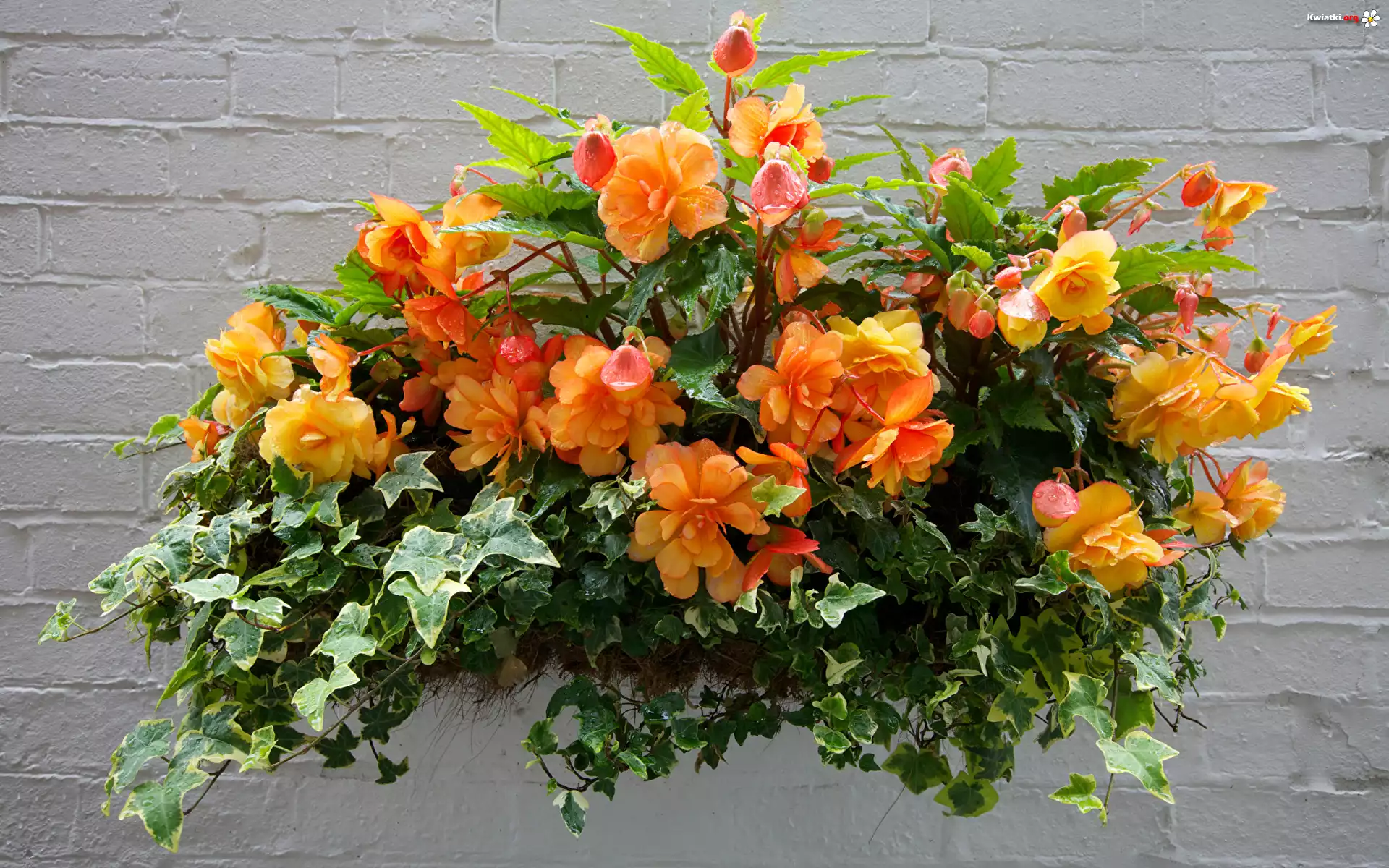 Kwiat Kwiaty, Pomarańczowe, Begonie, Bluszcz, Ściana