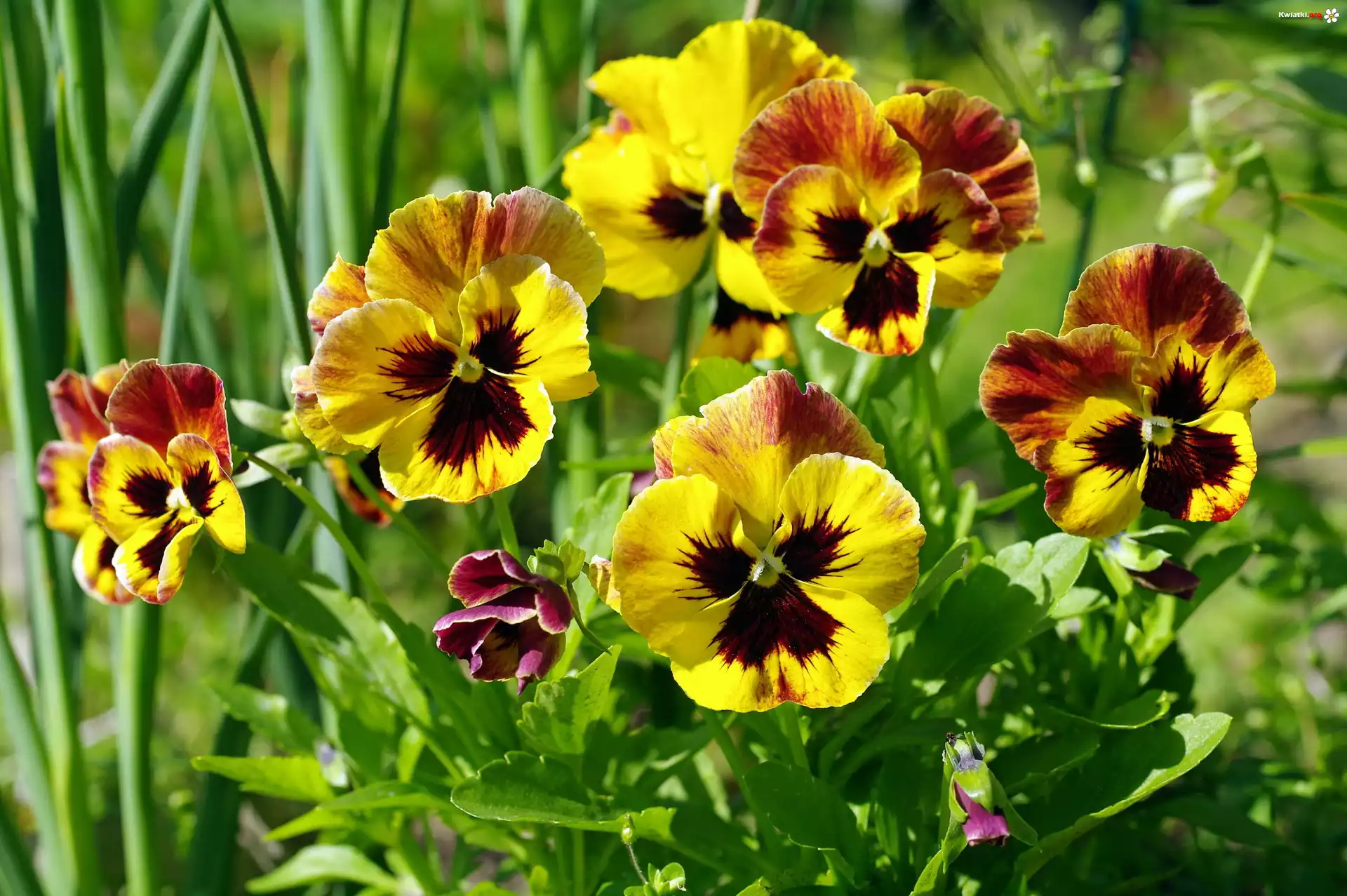 Dzika, Kaczka, Bratki Żółty, Bratek, Liście Kwiat, Bratek, Makro Fioletowo, Białe, Bratki Bratki Różne, Kolorowe, Kwiatki, Bratki, Rumianek,