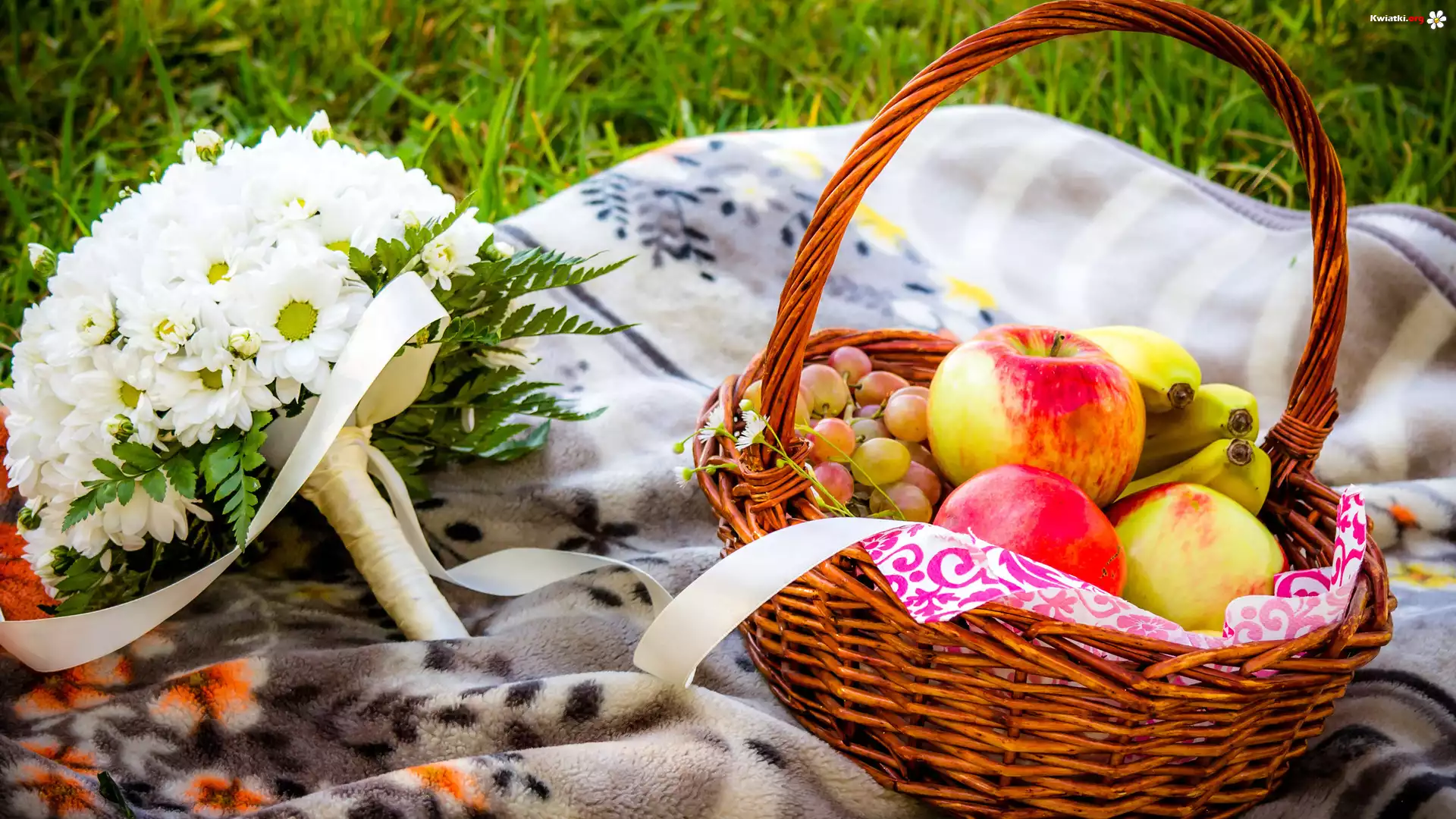 Kwiat Bukiet, Kwiaty, Margerytki, Wiklinowy, Koszyk, Jabłka, Trawa