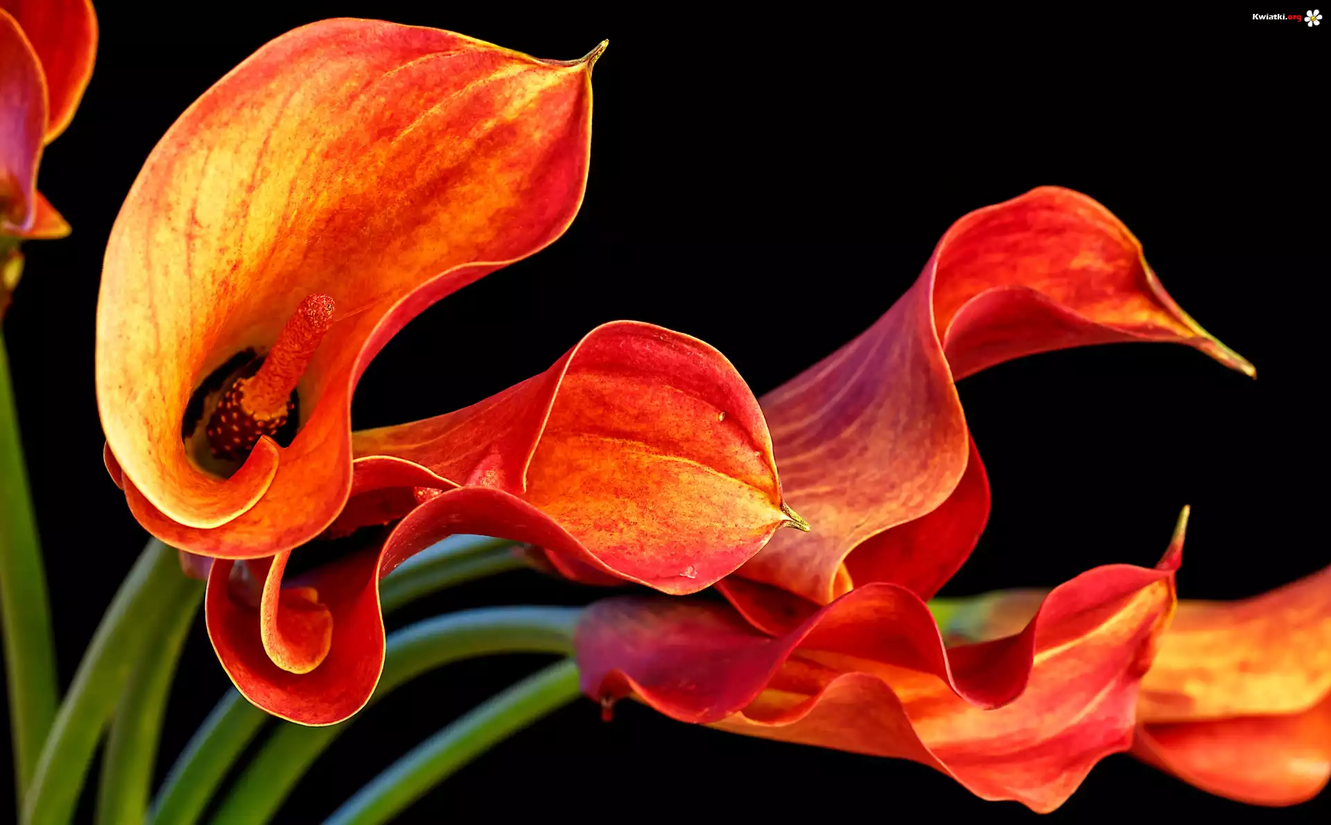 Kwiaty, Pomarańczowe, Kalie, Czarne tło - Zdjęcia