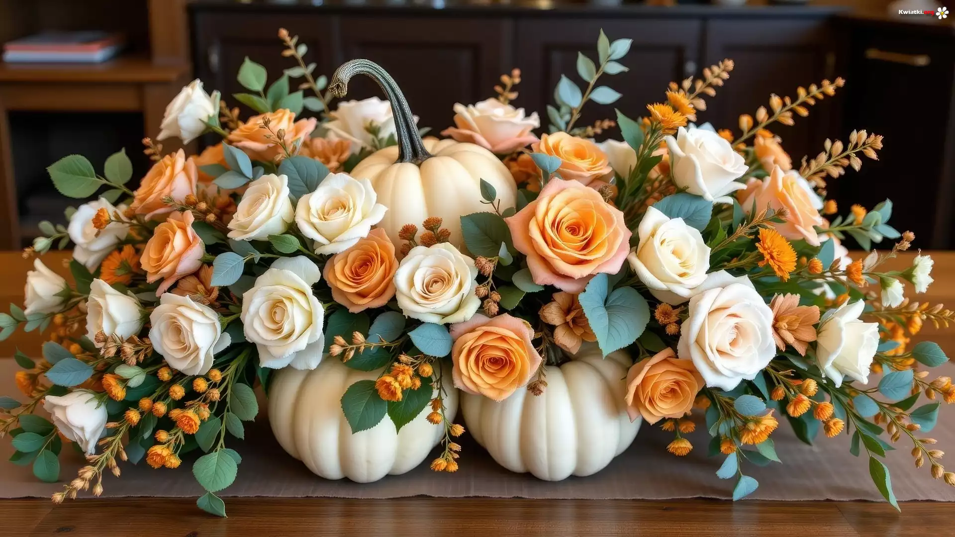 Trzy, Białe, Dynie, Kwiaty, Białe, Pomarańczowe, Róże - Zdjęcia