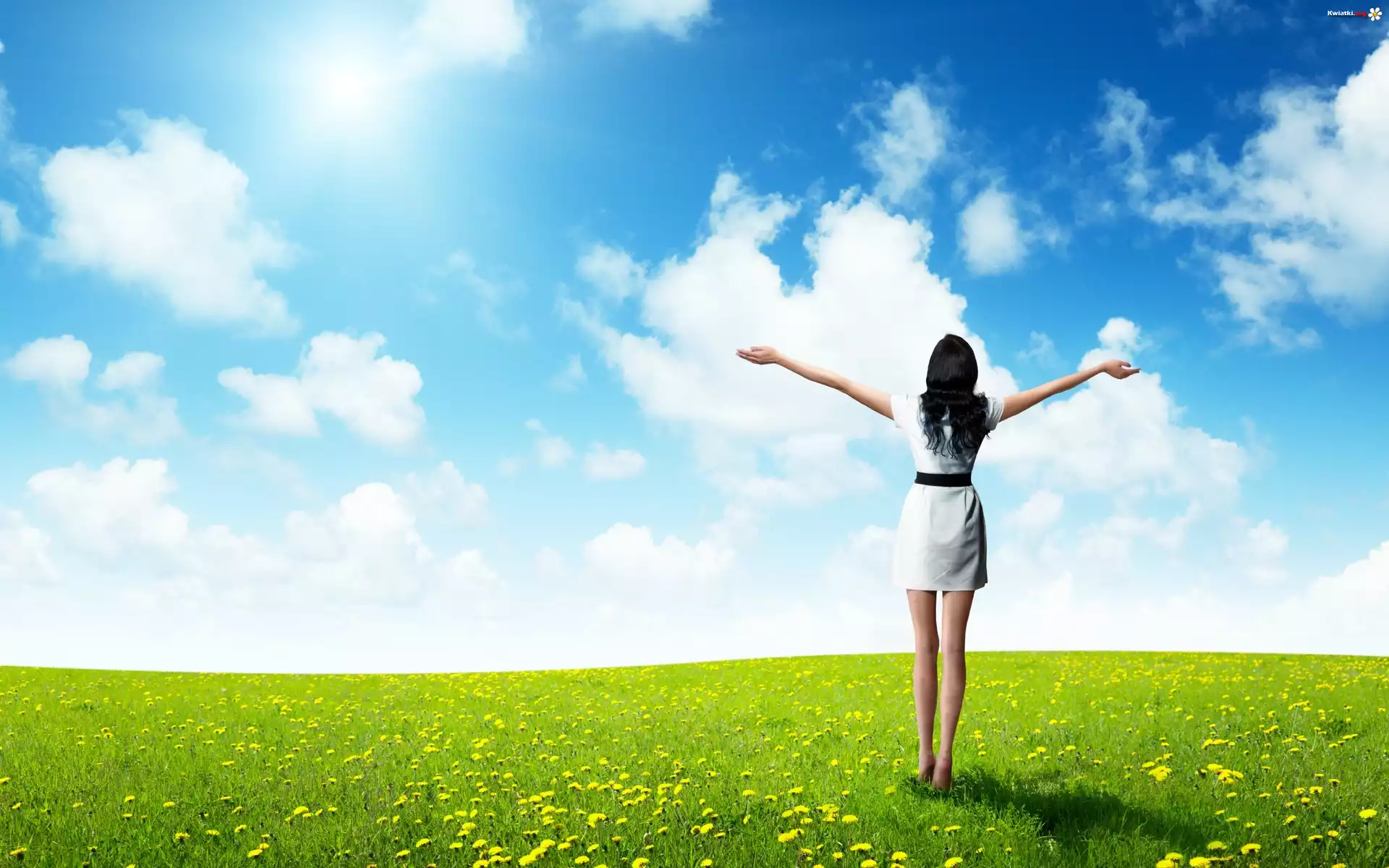 Łąka, Dziewczyna, Kwiaty, Niebo - Zdjęcia