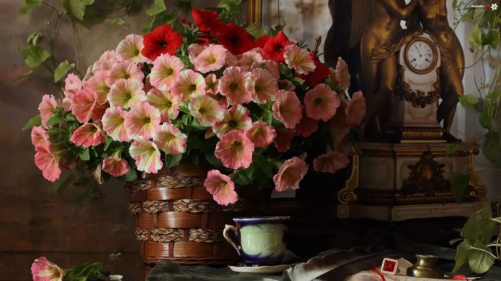 Kwiaty, Bukiet, Petunie, Filiżanka, Zegar - Zdjęcia
