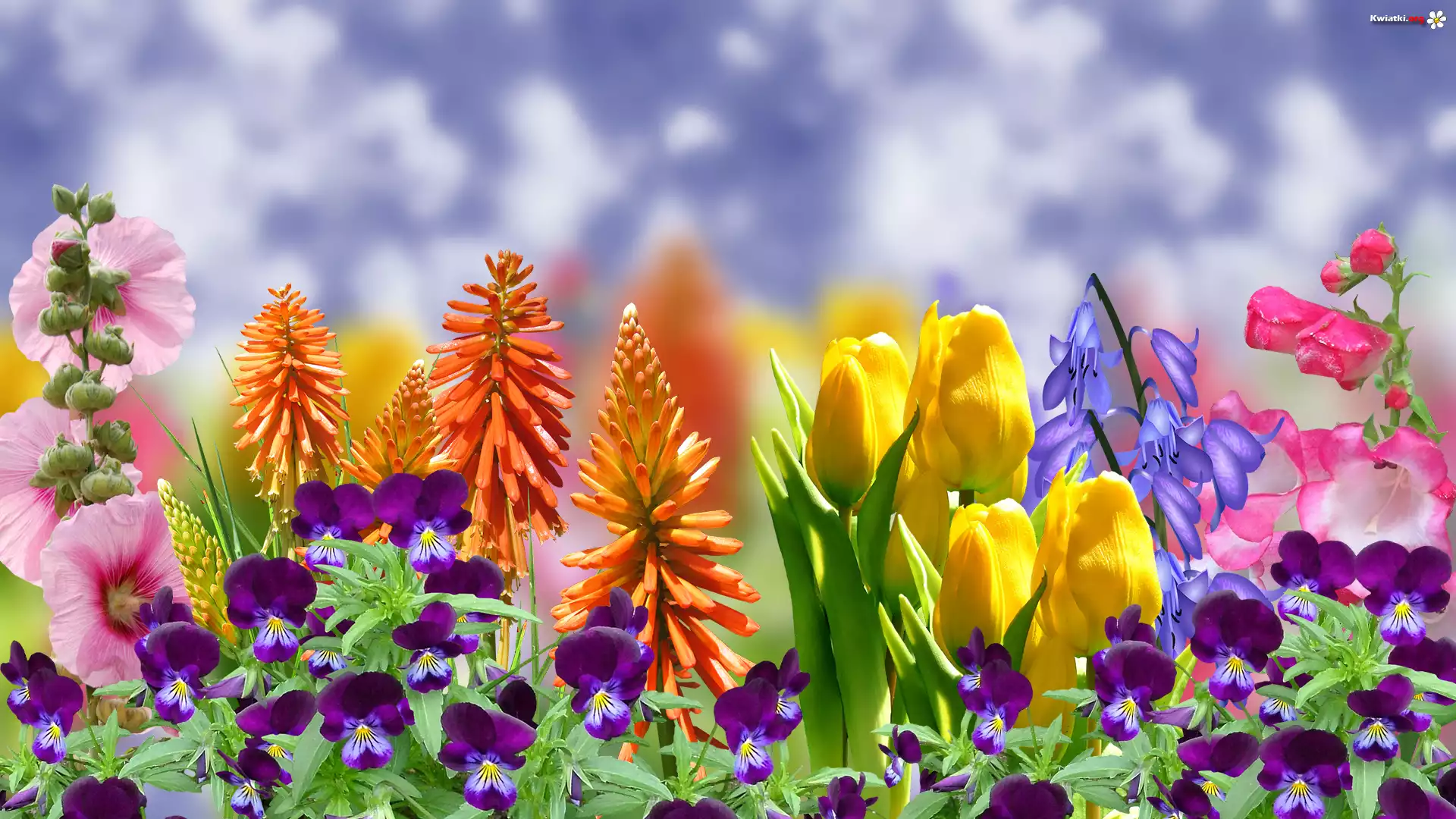 Kwiaty, Bratki, Tulipany, Trytoma groniasta, Malwa - Zdjęcia