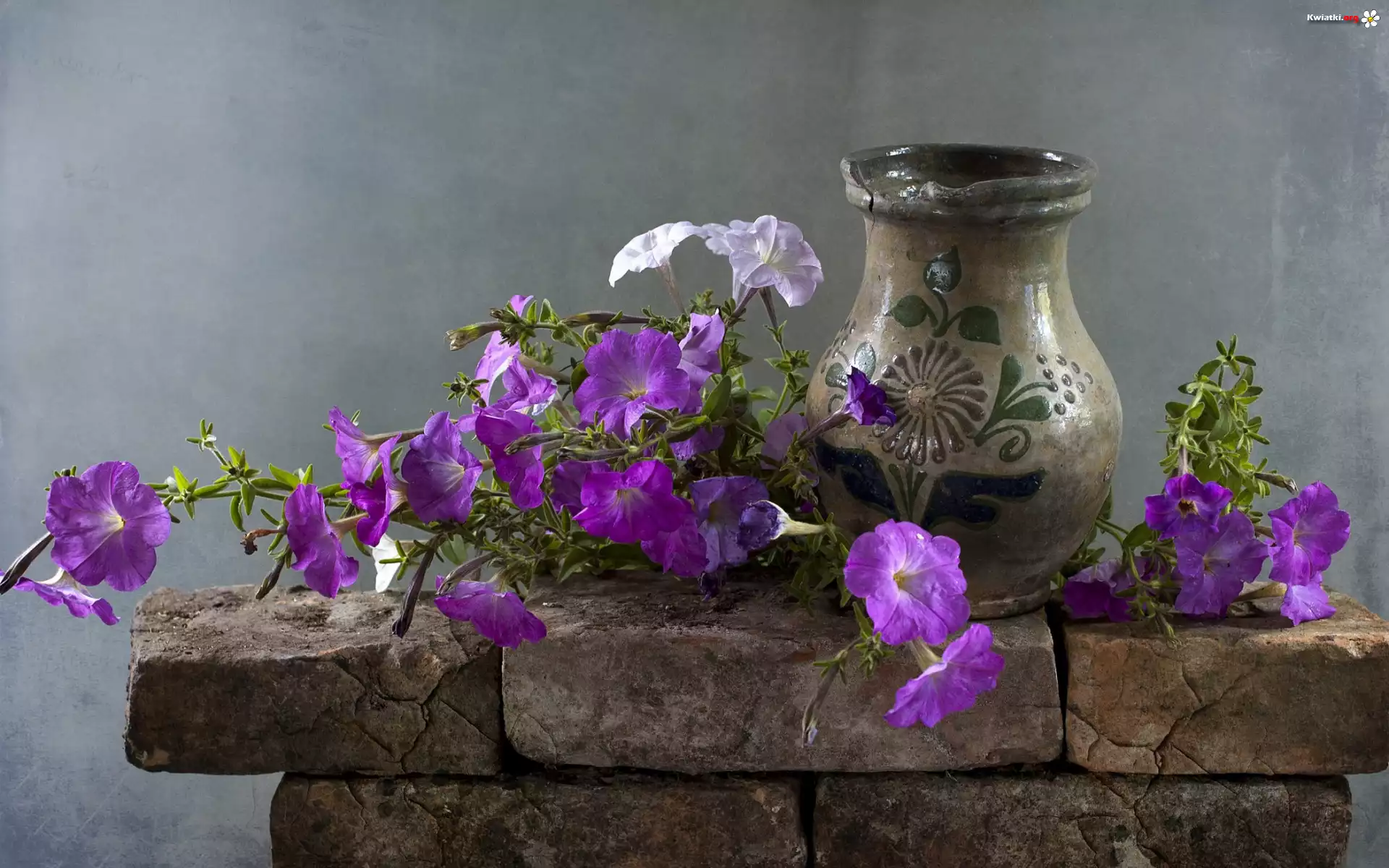 Kwiaty, Wazon, Fioletowe, Petunie, Kamienie, Kompozycja - Zdjęcia