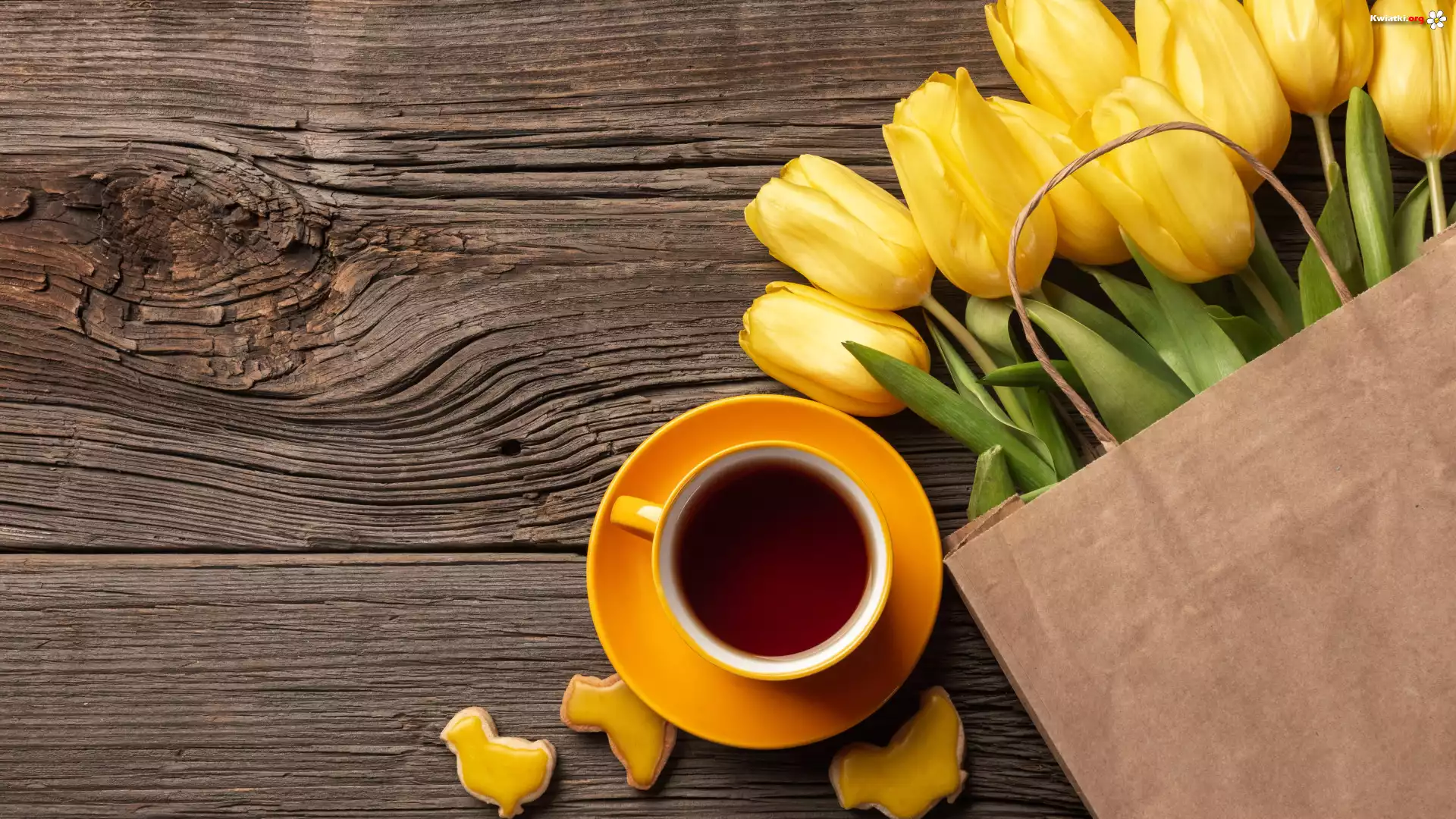 Kwiaty, Bukiet, Żółte, Tulipany, Torba, Filiżanka, Kawa, Spodek, Drewno - Zdjęcia